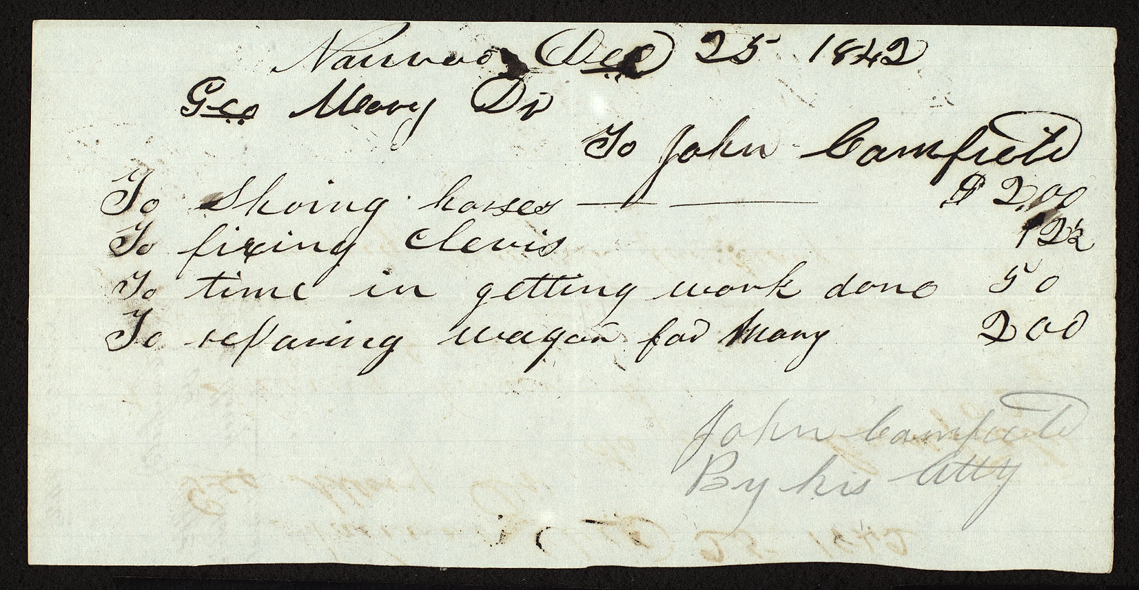 , Account, to , , Hancock Co., IL, 25 Dec. 1842, Canfield v. Morey (Nauvoo, IL, Mayor’s Court 1842); handwriting of ; docket by , [, Hancock Co., IL], [ca. 25 Dec. 1842]; two pages; Nauvoo, IL, Records, CHL.