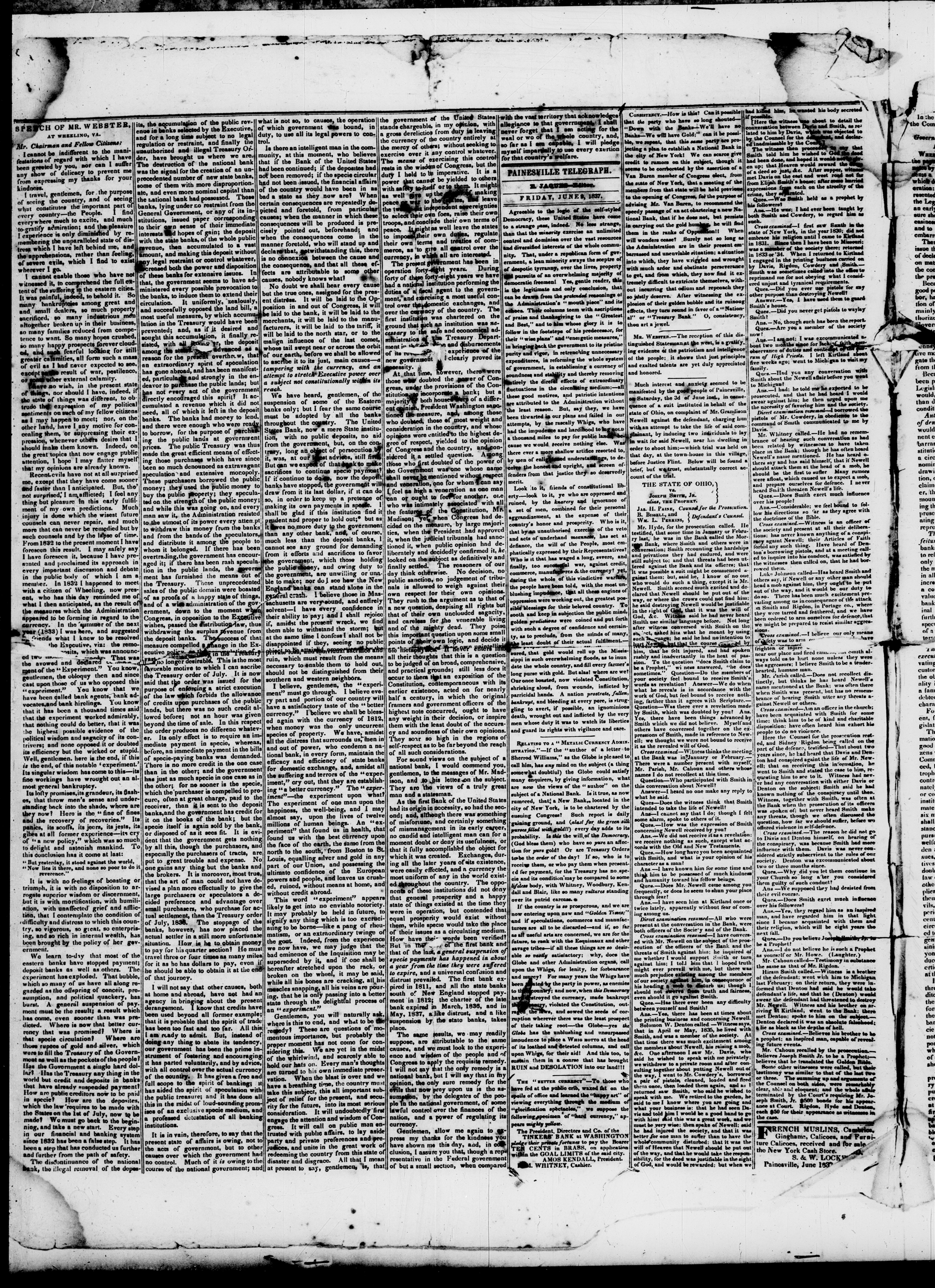 Account of Hearing, , Geauga Co., OH, between ca. 3 and 9 June 1837, State of OH v. JS for Threatening to Take Life (Painesville, OH, Justice of the Peace Court 1837). Published in Painesville (OH) Telegraph, 9 June 1837, [2].