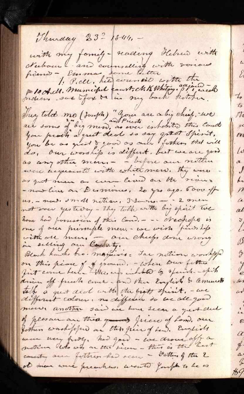 They told me (Joseph) “Your are a big chief, we are sons of <2 as> big men. <and Priests> as ever inhabited this land You preach a great deal so say great Spirit. you be as great & good as our fathers that will do. Our worship is differe[n]t. but we are good as any other men.—— before our nation were acquaintd with white men. th[e]y were as g[r]eat men as ever lived on th[e] —— now live on . 20 yrs ago. 6000 off us.— now. small nation. 3 towns.—— 2 men not over yesterday— they talk with big spirit we have had possession of this land.—— Neopope is one of our principle men.— we wish frie[n]dship with all men.— our cheefs done wrong in selling our Count[r]y.