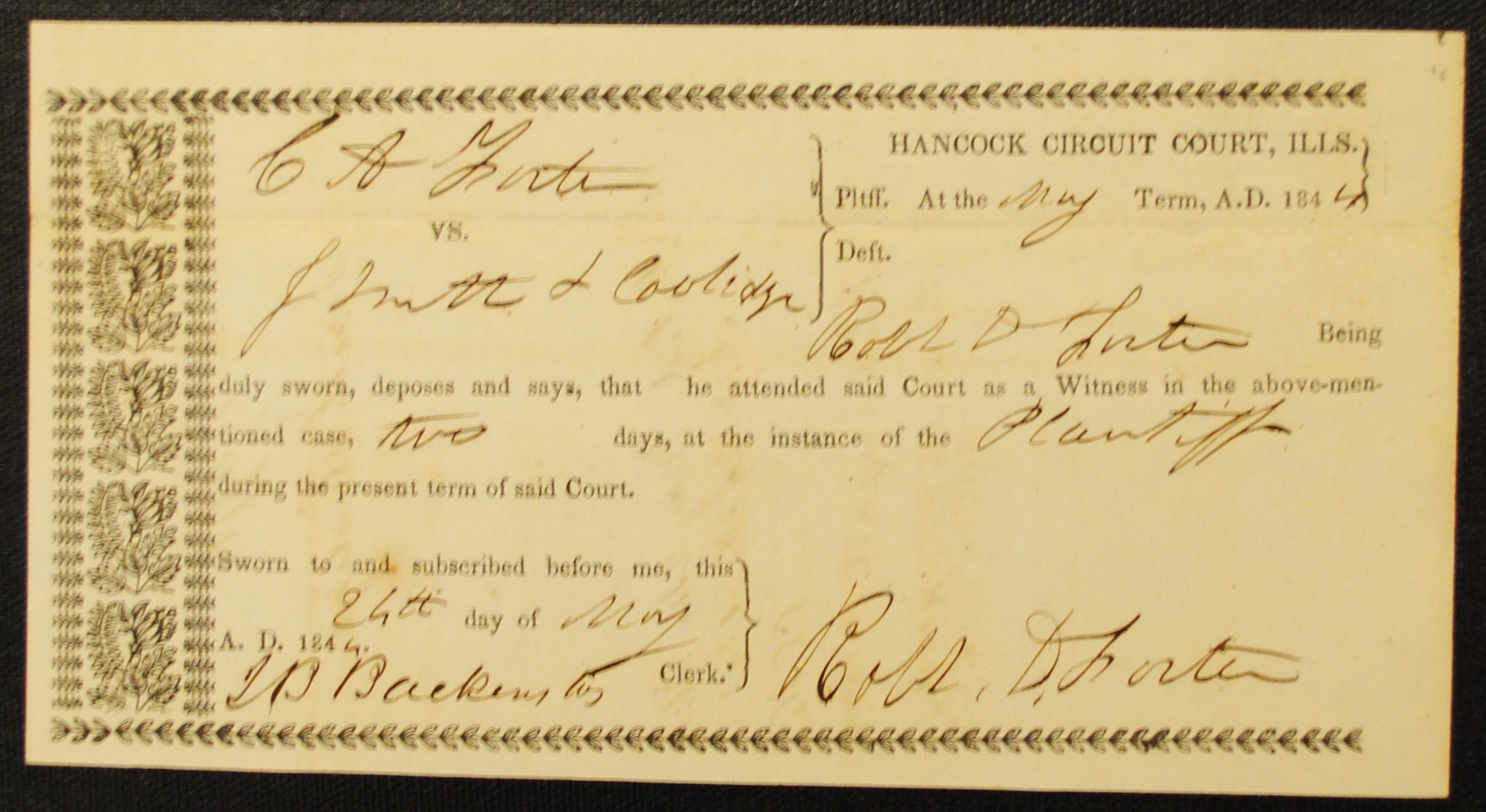 , Affidavit, before , [], Hancock Co., IL, 24 May 1844, C. A. Foster v. JS and Coolidge (Hancock Co., IL, Circuit Court 1844); printed form with manuscript additions in handwriting of ; possibly certified by , 24 May 1844; docket and notation by , [, Hancock Co., IL], 24 May 1844; notation by , [, McDonough Co., IL], 12 Aug. 1844; two pages; McDonough County Circuit Court Files, Illinois Regional Archives Depository vault, Archives and Special Collections, Leslie F. Malpass Library, Western Illinois University, Macomb.