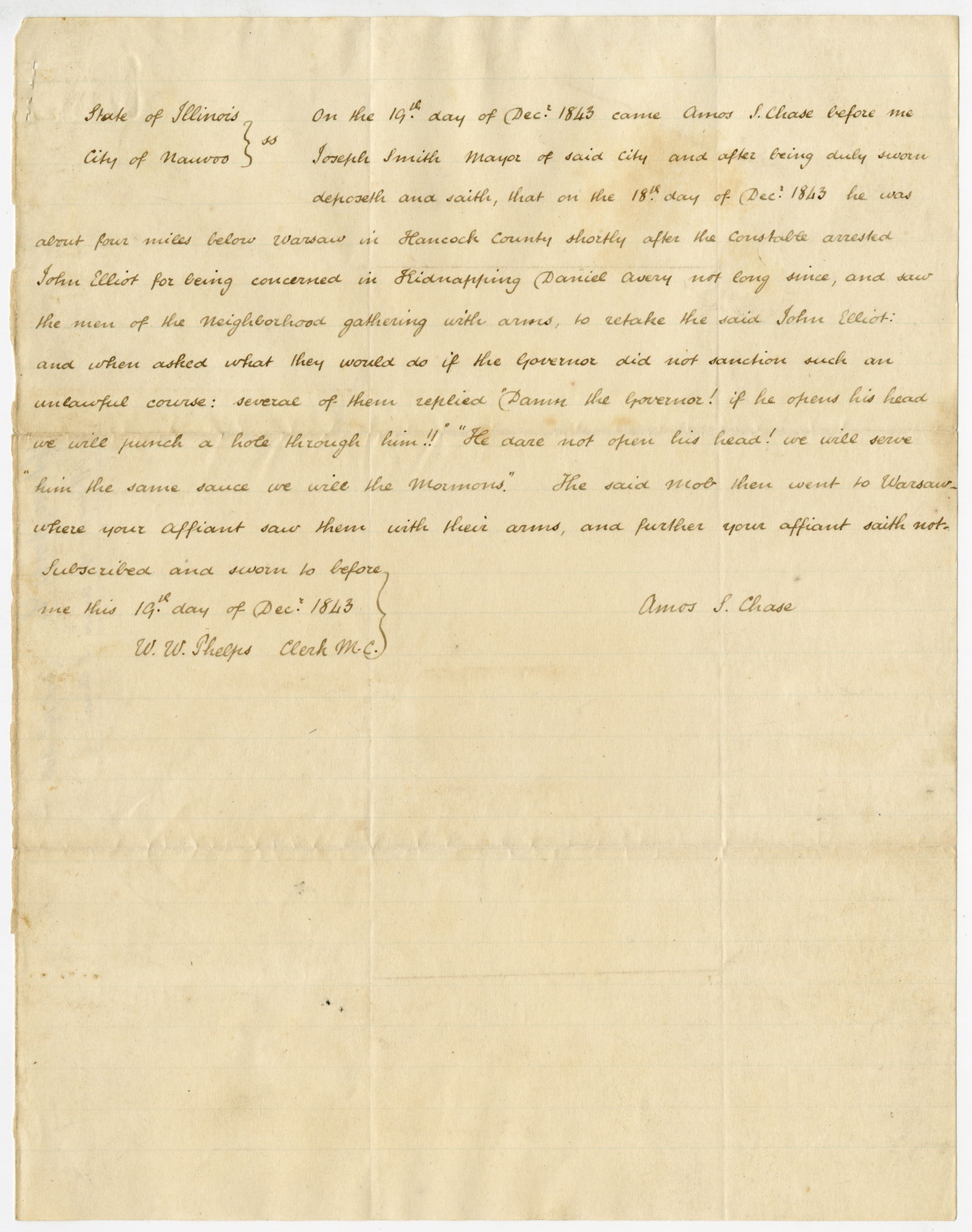 On the 19th. day of Decr. 1843 came Amos S Chase before me Joseph Smith Mayor of said and after being duly sworn deposeth and saith, that on the 18th. day of Decr. 1843 he was about four miles below in shortly after the Constable arrested for being concerned in Kidnapping not long since, and saw the men of the neighborhood gathering with arms, to retake the said : and when asked what they would do if the did not sanction such an unlawful course: several of them replied “Damn the ! if he opens his head we will punch a hole through him!!” “He dare not open his head! we will serve him the same sauce we will the Mormons.” The said mob then went to — where your Affiant saw them with their arms, and further your affiant saith not.