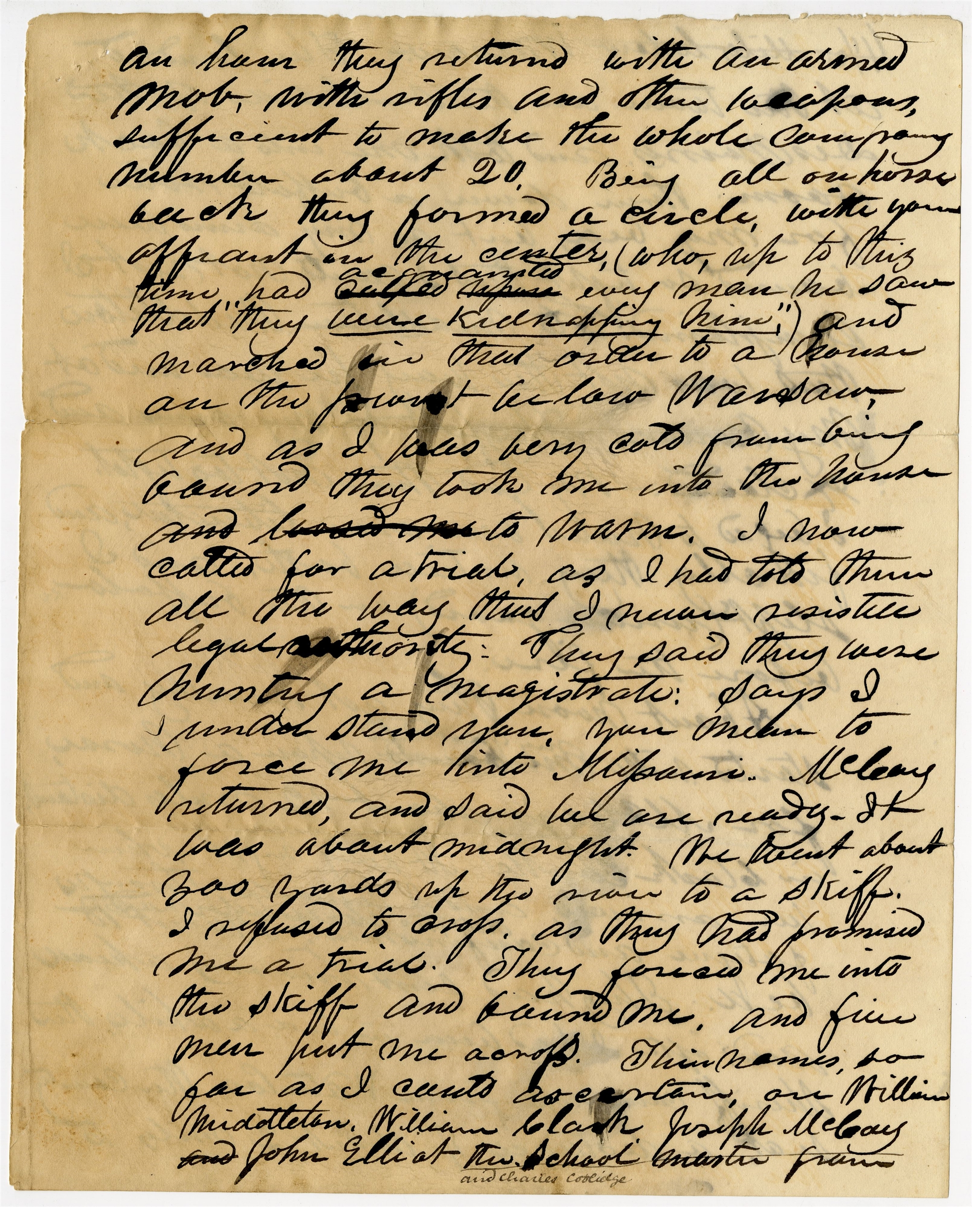 Earlier, Avery stated that he was forcibly removed from Illinois “notwithstanding the remonstrances and often repeated demands . . . for their authority & by what process he was so seized & detained— That no writ was shown to or served upon him in any way— that his demands for writ of Habeas Corpus were utterly & entirely refused.” (Daniel Avery, Petition for Writ of Habeas Corpus, Clark Co., MO, 5 Dec. 1843, State of Missouri v. Daniel Avery [Clark Co. Cir. Ct. 1843], Clark County Circuit Clerk’s Office, Clark County Courthouse, Kahoka, MO.)