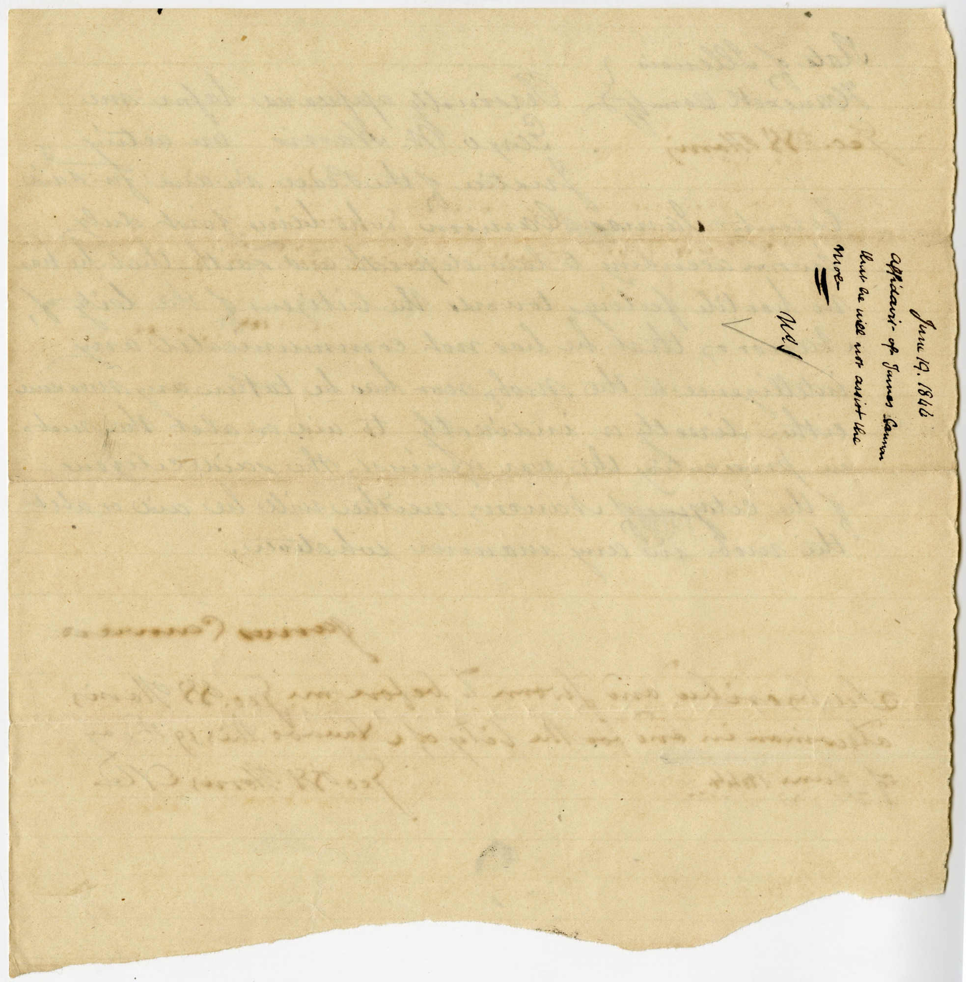 James Camron, Affidavit, before , , IL, 19 June 1844; handwriting of ; signature of James Camron; certified by ; docket in handwriting of ; one page; JS Office Papers, CHL.