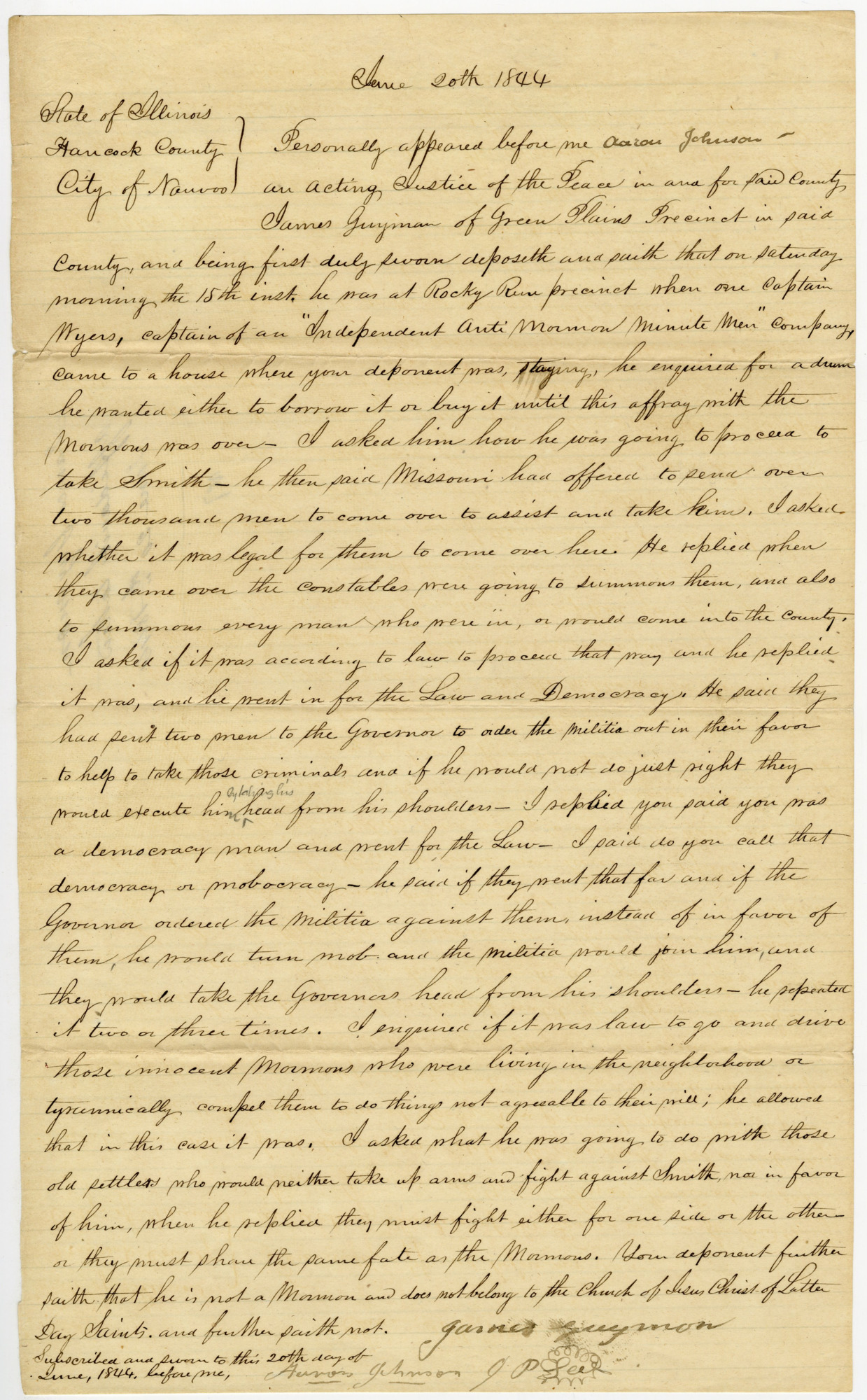 Personally appeared before me <—> an acting Justice of the Peace in and for said James Guyman of Green Plains Precinct in said , and being first duly sworn deposeth and saith that on Saturday morning the 15th inst. he was at Rocky Run precinct when one Captain Myers, captain of an “Independent Anti Mormon Minute Men” Company, came to a house where your deponent was, staying, he enquired for a drum he wanted either to borrow it or buy it until this affray with the Mormons was over— I asked him how he was going to proceed to take Smith— he then said had offered to send over two thousand men to come over to assist and take him. I asked whether it was legal for them to come over here. He replied when they came over the Constables were going to summons them, and also to summons every man who were in, or would come into the . I asked if it was according to law to proceed that way and he replied it was, and he went in for the Law and Democracy. He said they had sent two men to the to order the militia out in their favor to help to take those criminals and if he would not do just right they would execute his head from his shoulders— I replied you said you was a democracy man and went for the Law— I said do you call that democracy or mobocracy— he said if they went that far and if the ordered the militia against them, instead of in favor of them, he would turn mob and the militia would join him, and they would take the s head from his shoulders— he repeated it two or three times. I enquired if it was law to go and drive those innocent Mormons who were living in the neighborhood or tyrannically compel them to do things not agreeable to their will; he allowed that in this case it was. I asked what he was going to do with those old settlers who would neither take up arms and fight against Smith, nor in favor of him, when he replied they must fight either for one side or the other— or they must share the same fate as the Mormons. Your deponent further saith the he is not a Mormon and does not belong to the . and further saith not.