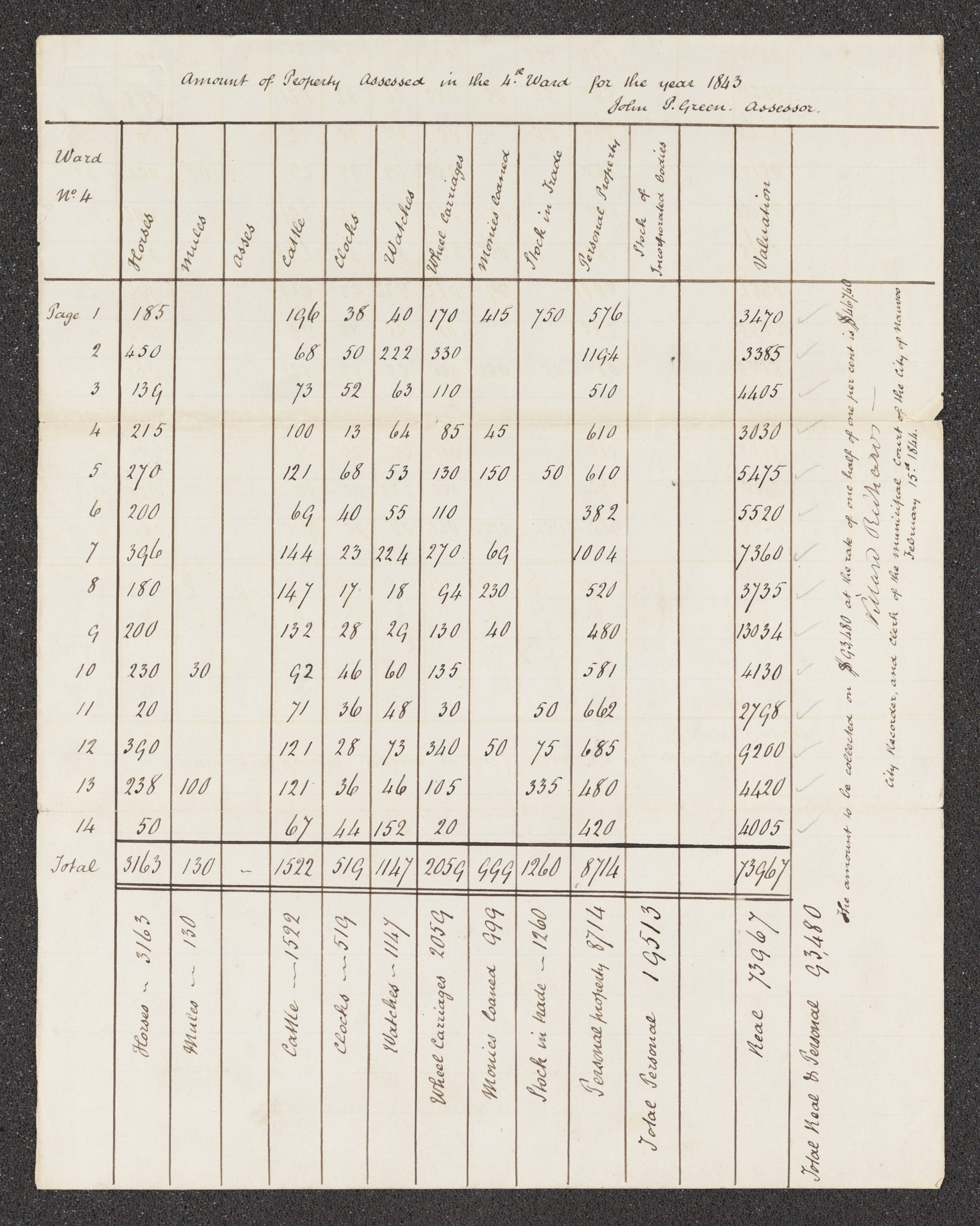 | Ward No. 4 | Horses | Mules | Asses | Cattle | Clocks | Watches | Wheel Carriages | Monies loaned | Stock in Trade | Personal Property | Stock of Incorporated bodies | Valuation | |