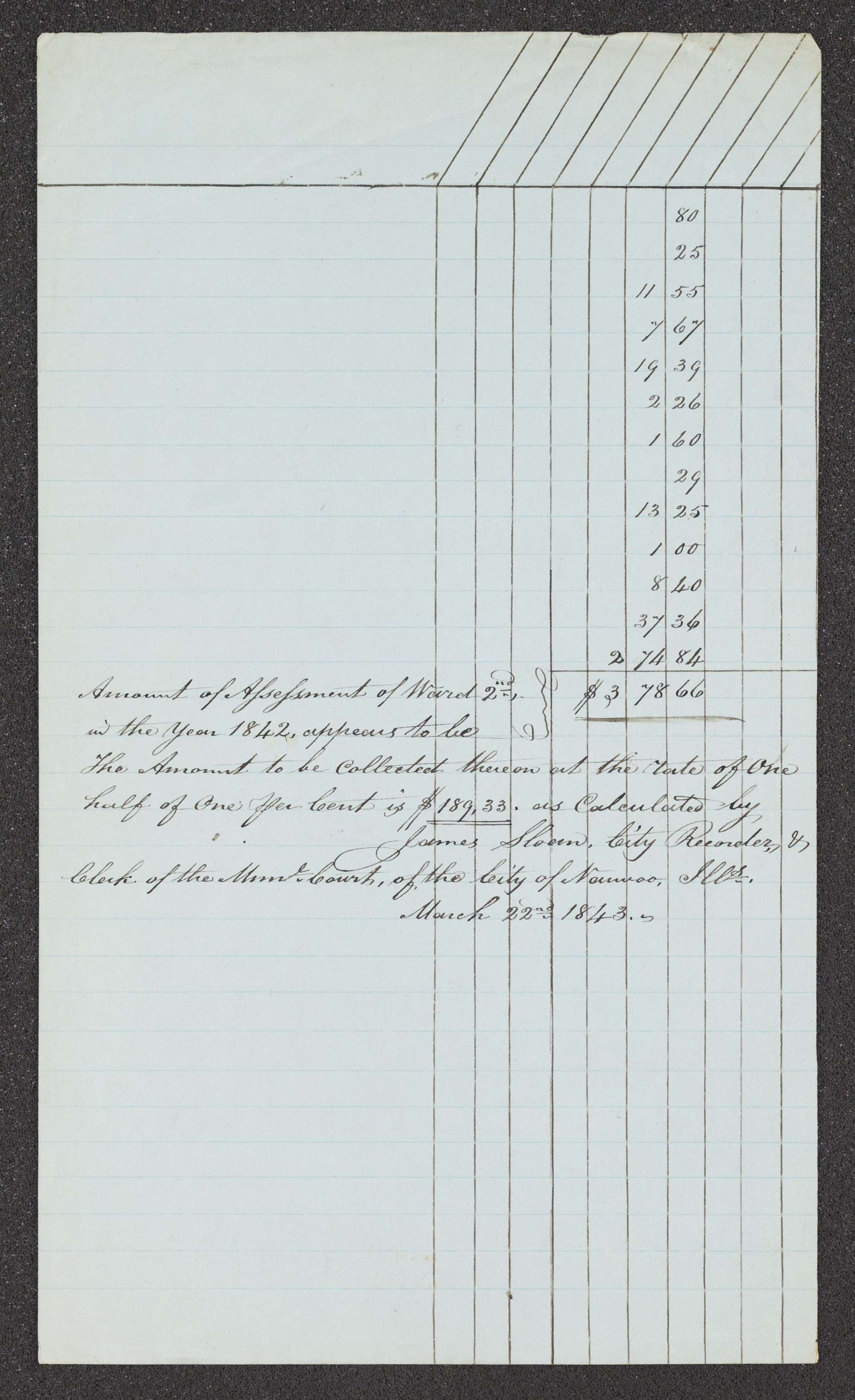 , Aggregate Assessment of Property, second ward for 1842, , Hancock Co., IL, 22 Mar. 1843; handwriting of ; two pages; Nauvoo, IL, Records, 1841–1845, CHL.