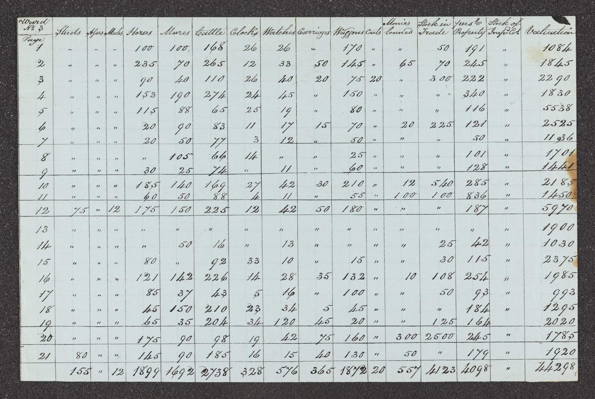 | Ward No 3 | Studs | Asses | Mules | Horses | Mares | Cattle | Clocks | Watches | Carriages | Waggons | Carts | Monies loaned | Stock in Trade | persl Property | Stock of Incpd Cos | Valuation |