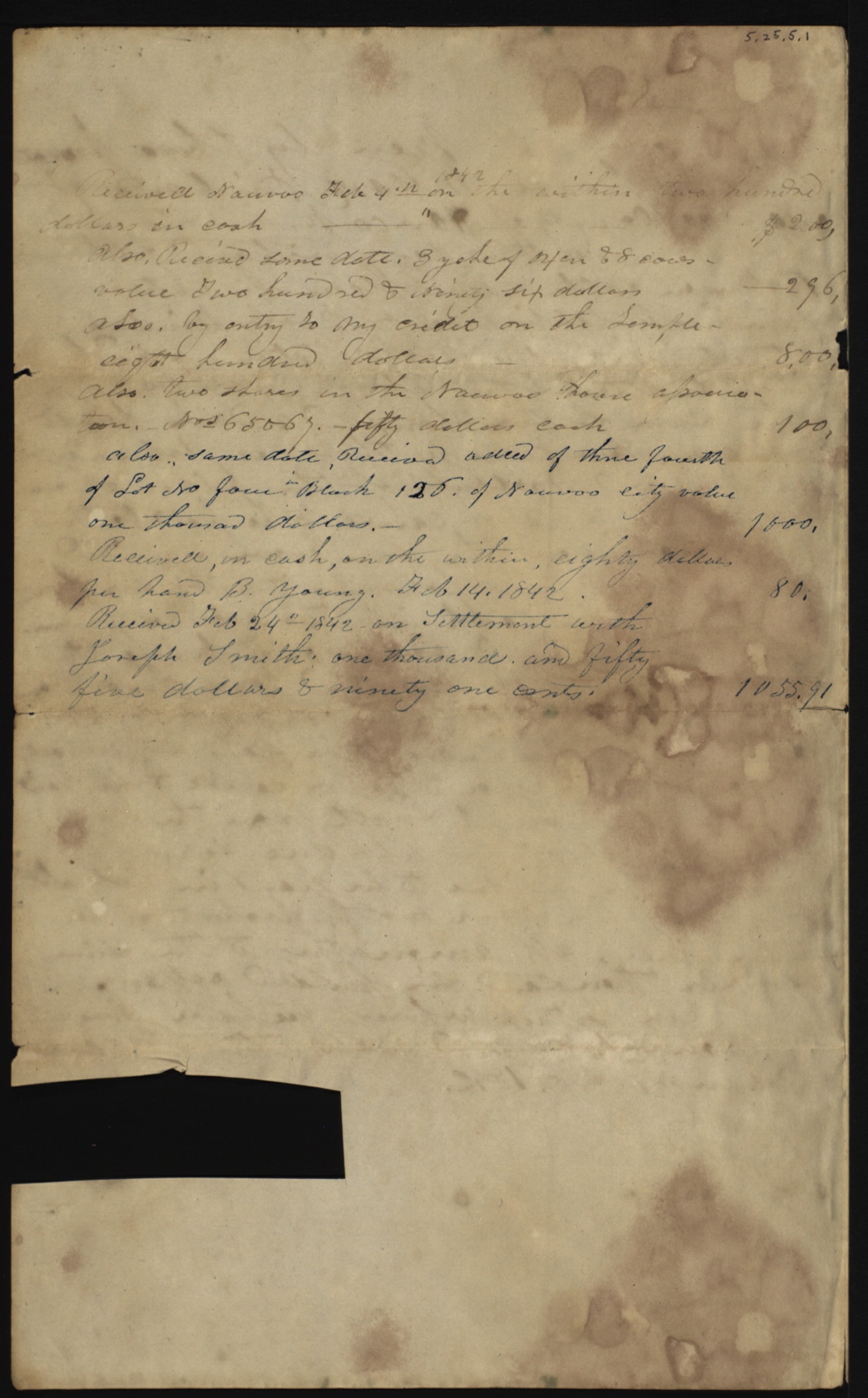 | Received Feb 24th 1842— on Settlement with Joseph Smith, one thousand, and fifty five dollars & ninety one cents. | 1055.91 |
