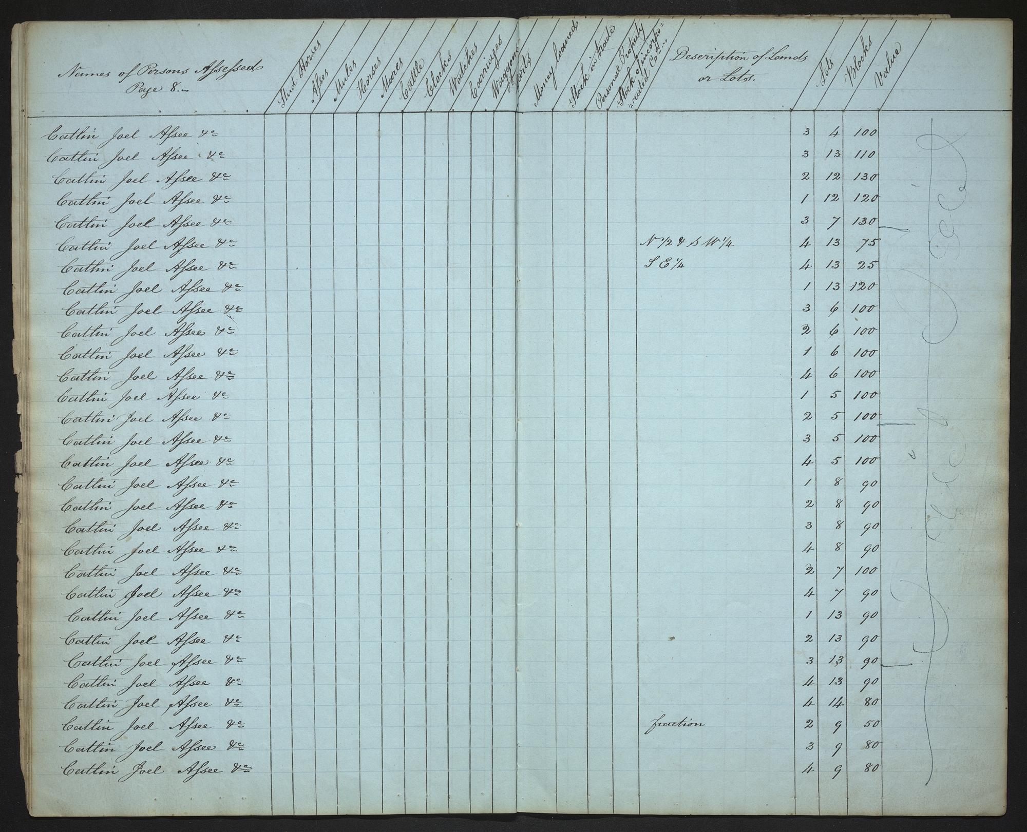 | Names of Persons AssessedPage 8.— | Stud Horses | Asses | Mules | Horses | Mares | Cattle | Clocks | Watches | Carriages | Waggons | Carts | Money loaned | Stock in trade | Peronal Property | Stock of incorporated Cos— | Description of Lands or Lots. | Lots | Blocks | Value | |