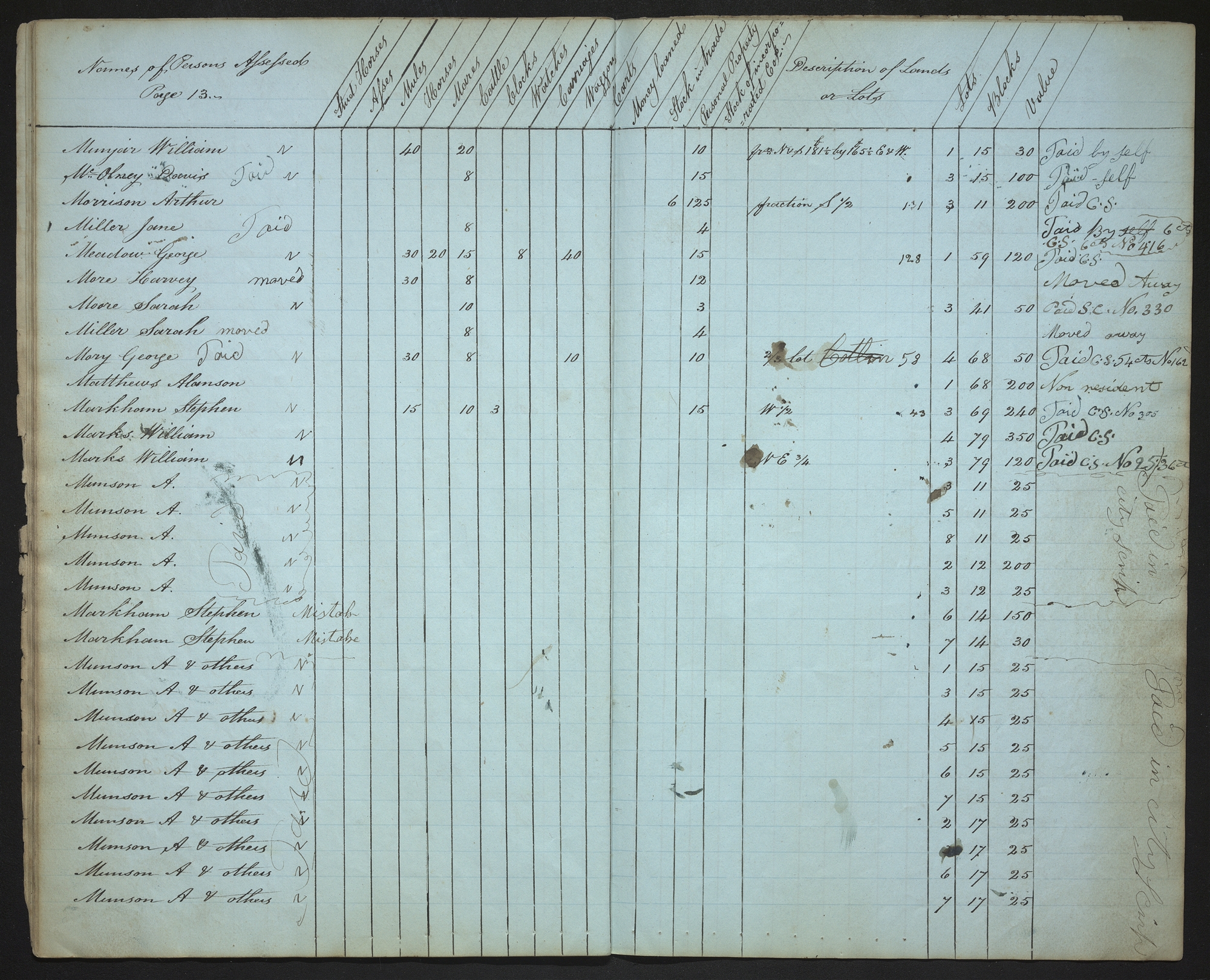 | Names of Persons Assessed Page 13.— | Stud Horses | Asses | Mules | Horses | Mares | Cattle | Clocks | Watches | Carriages | Waggons | Carts | Money loaned | Stock in trade | Personal Property | Stock of incorporated cos.— | Description of Lands or Lots | Lots | Blocks | Value | |