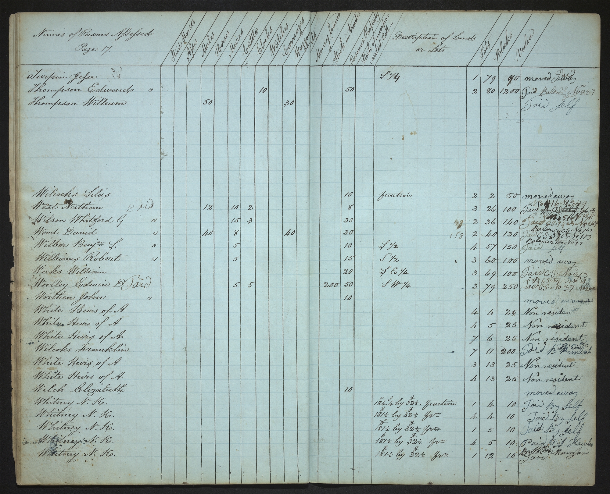 | Names of Persons Assessed Page 17. | Stud Horses | Asses | Mules | Horses | Mares | Cattle | Clocks | Watches | Carriages | Waggoms | Carts | Money loaned | Stock in trade | Personal Property | Stock of incorporated cos.— | Description of Lands or Lots | Lots | Blocks | Value | |