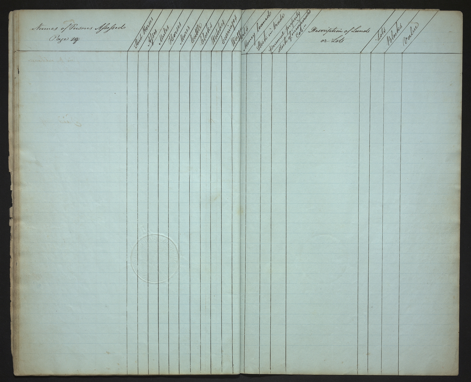 | Names of Persons Assessed Page 19 | Stud Horses | Asses | Mules | Horses | Mares | Cattle | Clocks | Watches | Carriages | Waggons | Carts | Money loaned | Stock in trade | personal property | Stocks of incorporated cos.— | Description of Lands or Lots | Lots | Blocks | Value |