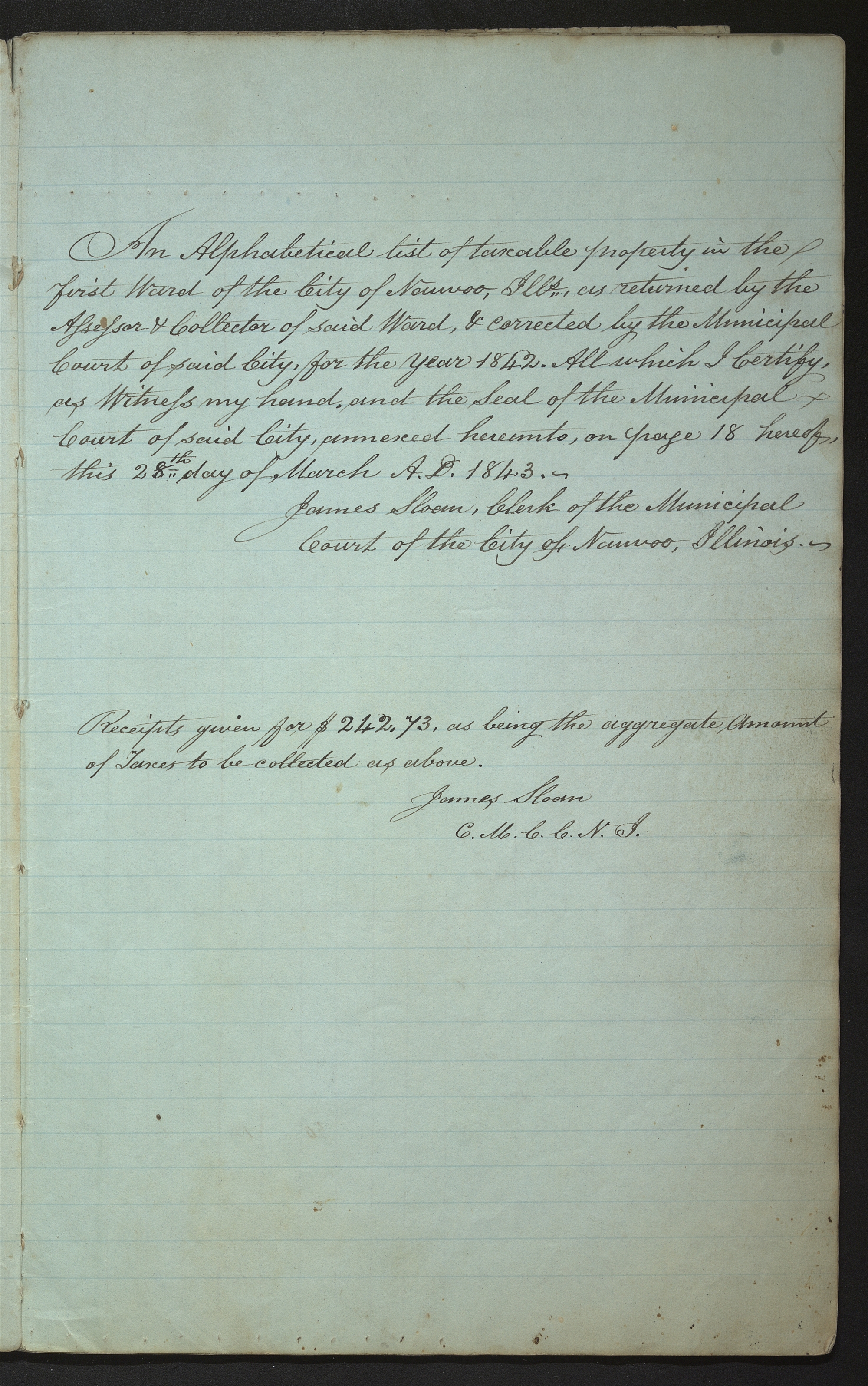 , Alphabetical List of Property in first ward for 1842, , Hancock Co., IL; inscribed [ca. Feb.]–28 Mar. 1843; handwriting of , , an unidentified scribe, and ; twenty-two pages; Nauvoo, IL, Records, 1841–1845, CHL. Includes seal.