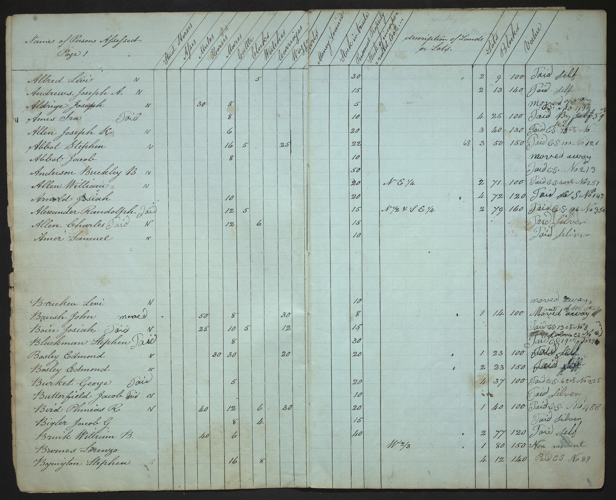 | Names of Persons AssessedPage 1 | Stud Horses | Asses | Mules | Horses | Mares | Cattle | Clocks | Watches | Carriages | Waggons | Carts | Money loaned | Stock in trade | Personal Property | Stocks of incorporated Cos.— | description of Lands or Lots. | Lots | Blocks | Value | |