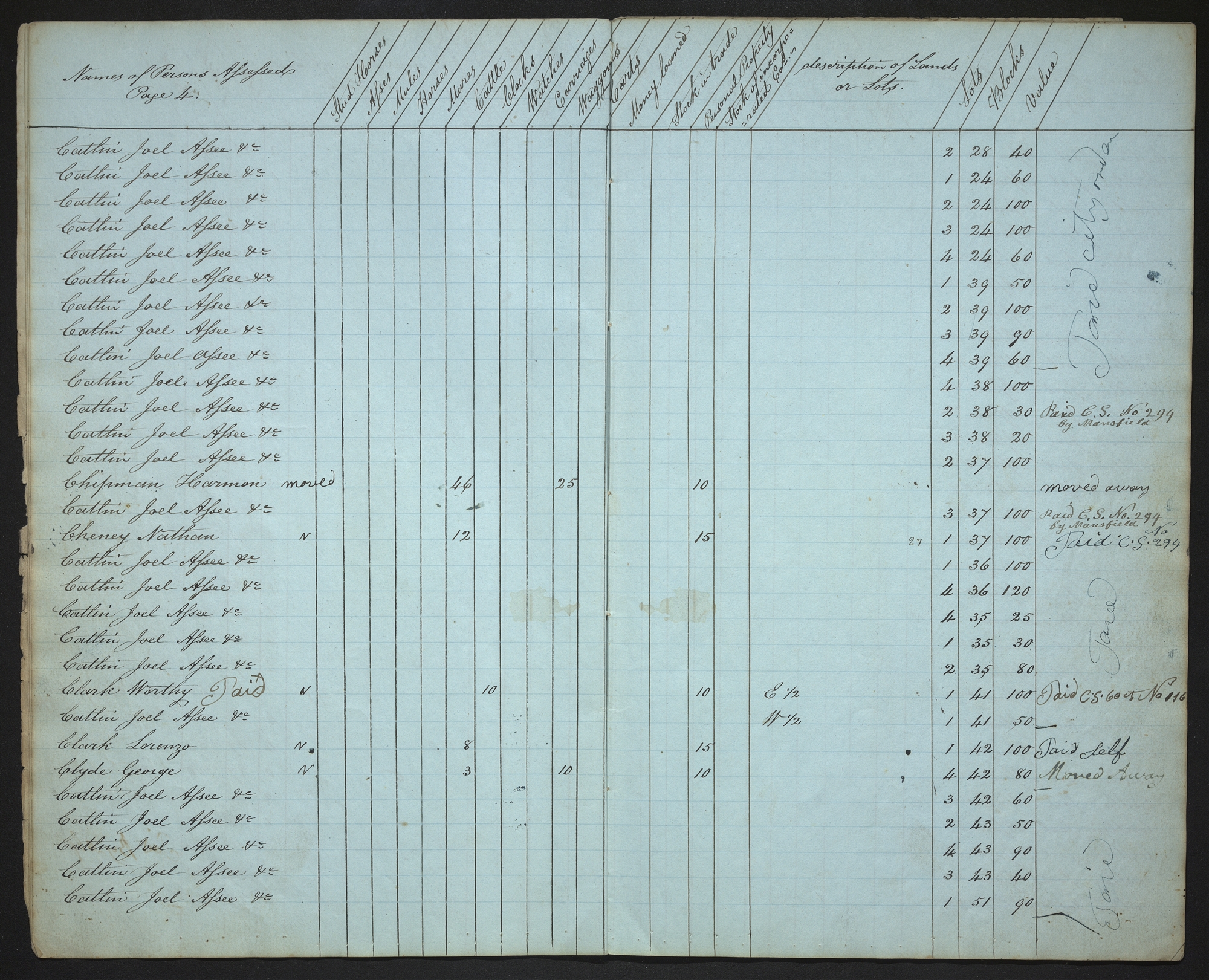 | Names of Persons Assessed Page 4. | Stud Horses | Asses | Mules | Horses | Mares | Cattle | Clocks | Watches | Carriages | Waggons | Carts | Money loaned | Stock in trade | Personal Property | Stocks of incorporated cos. | description of Lands or Lots. | Lots | Blocks | Value | |
