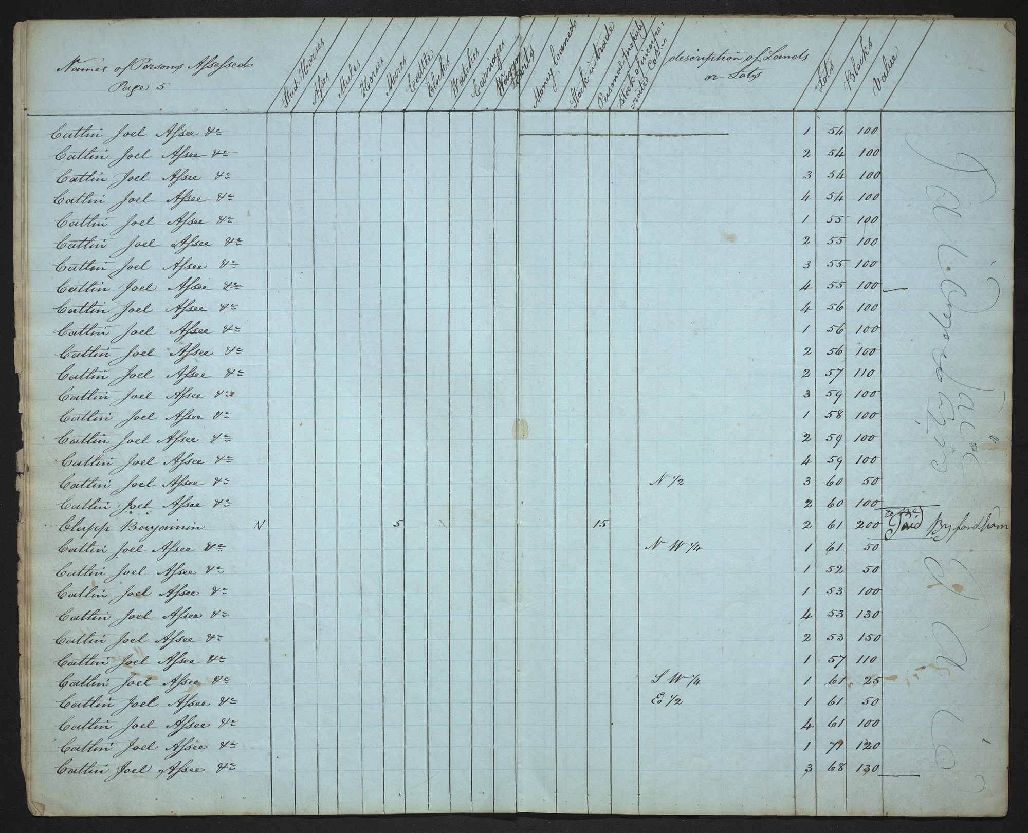 | Names of Persons Assessed Page 5 | Stud Horses | Asses | Mules | Horses | Mares | Cattle | Clocks | Watches | Carriages | Waggons | Carts | Money loaned | Stock in trade | Personal Property | stocks of incorporated cos | description of Lands or Lots | Lots | Blocks | Value | |