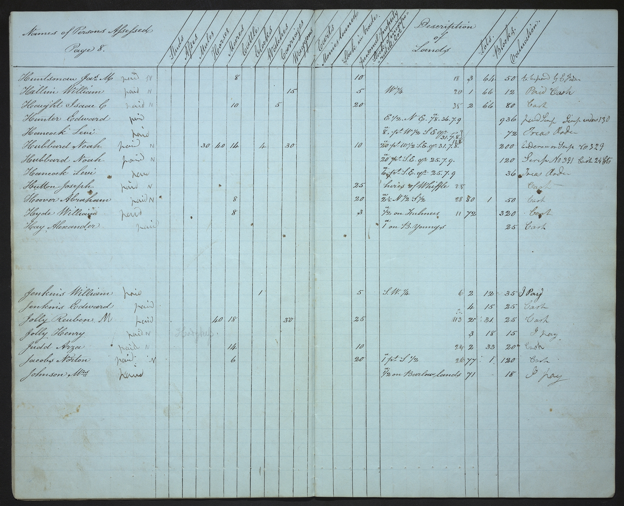 | Names of Persons Assessed Page 8. | Studs | Asses | Mules | Horses | Mares | Cattle | Clocks | Watches | Carriages | Waggons | Courts | Monies loaned | Stock in trade. | personal property | Stock of incorporated Cos. | Description of Lands | Lots. | Blocks. | Valuation. | |