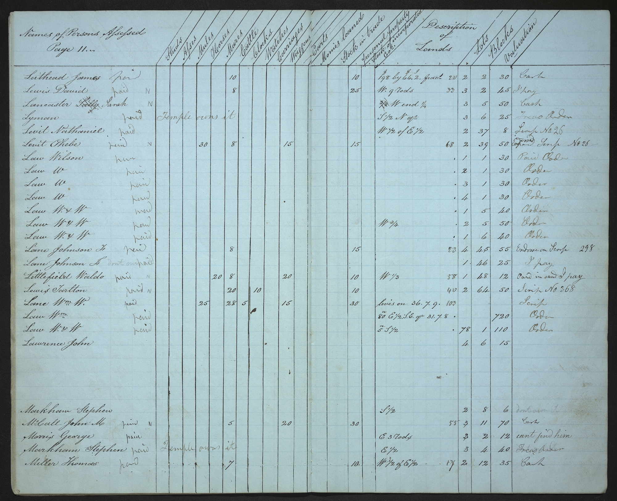 | Names of Persons Assessed Page 11. | Studs | Asses | Mules | Horses | Mares | Cattle | Clocks | Watches | Carriages | Waggons | Carts | Monies loaned | Stock in trade | personal property | Stock of incorporated Cos. | Description of Lands | Lots | Blocks | Valuation | |