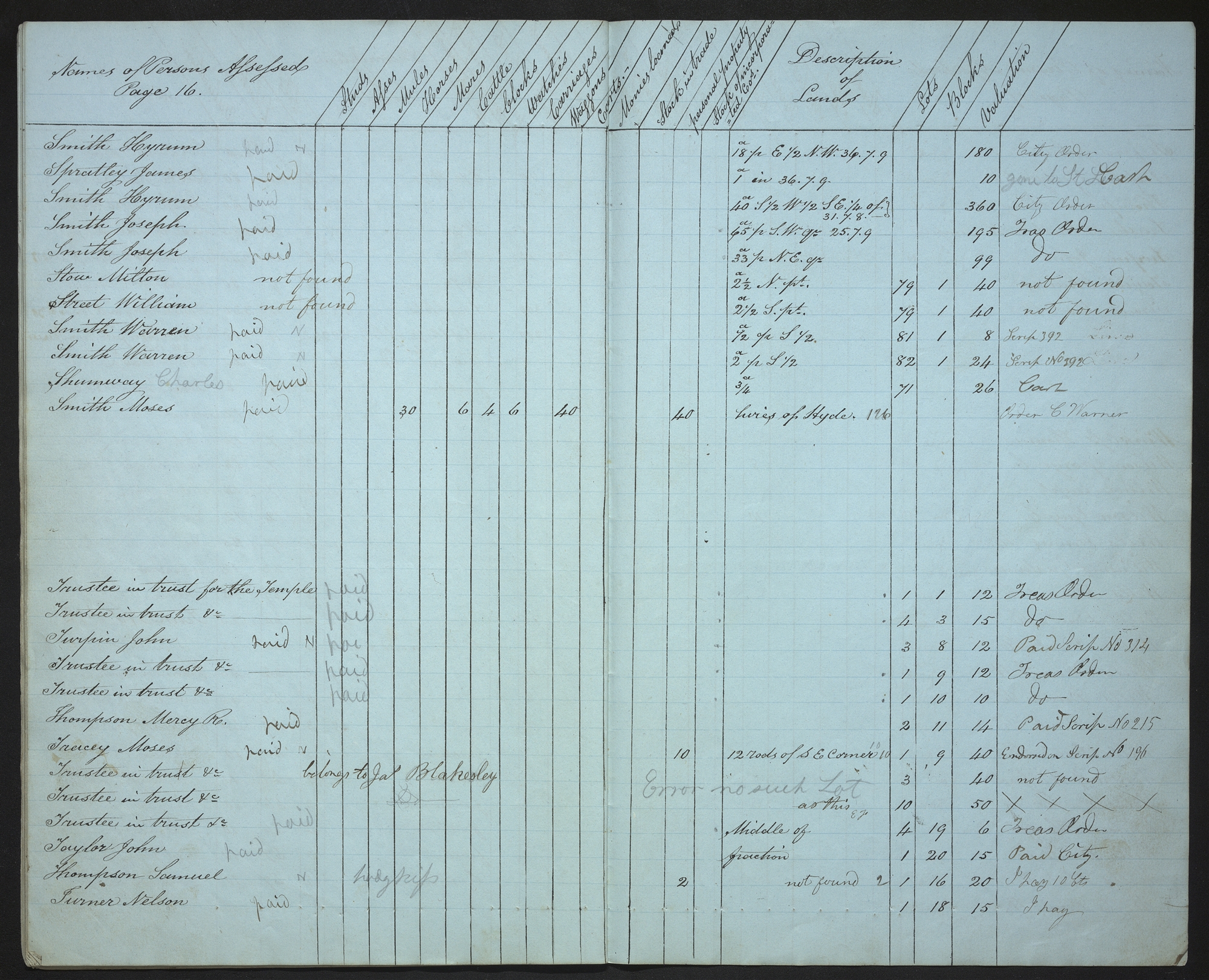 | Names of Persons Assessed Page 16. | Studs | Asses | Mules | Horses | Mares | Cattle | Clocks | Watches | Carriages | Waggons | Carts. | Monies loaned | Stock in trade | personal property | Stock of incorporated Cos. | Description of Lands | Lots | Blocks | Valuation | |