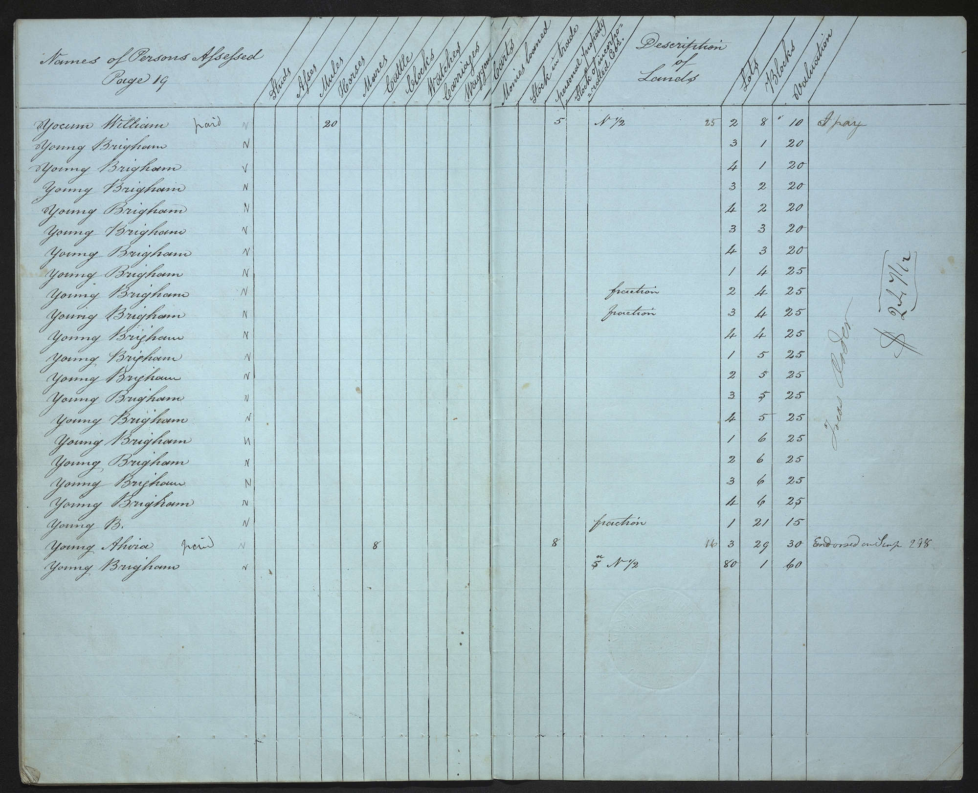 | Names of Persons Assessed Page 19 | Studs | Asses | Mules | Horses | Mares | Cattle | Clocks | Watches | Carriages | Waggons | Carts | Monies loaned | Stock in trade | personal property | Stock of incorporated Cos. | Description of Lands | Lots | Blocks | Valuation | |