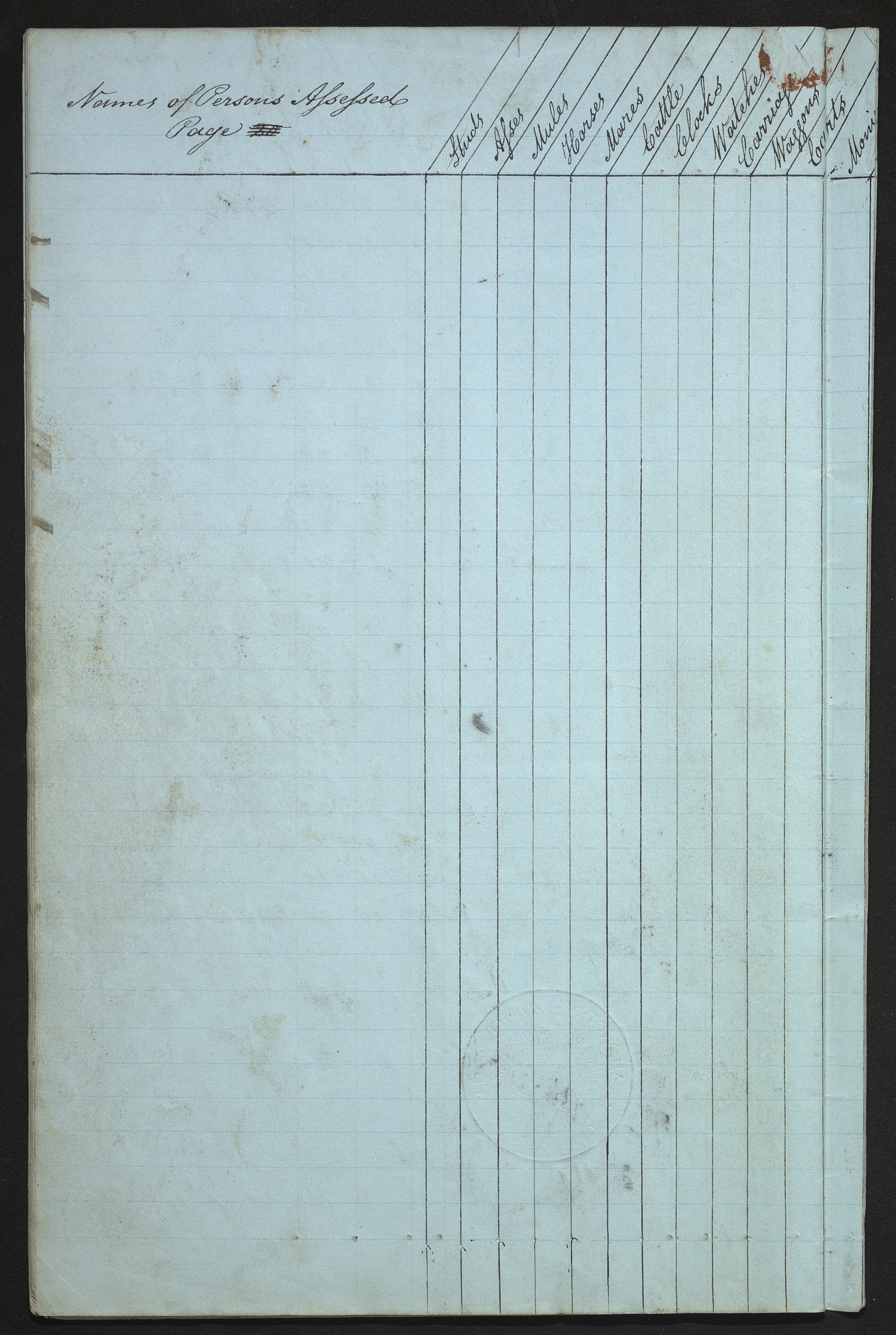 | Names of Persons Assessed Page 20 | Studs | Asses | Mules | Horses | Mares | Cattle | Clocks | Watches | Carriage | Waggons | Carts | Moni[es loaned] |