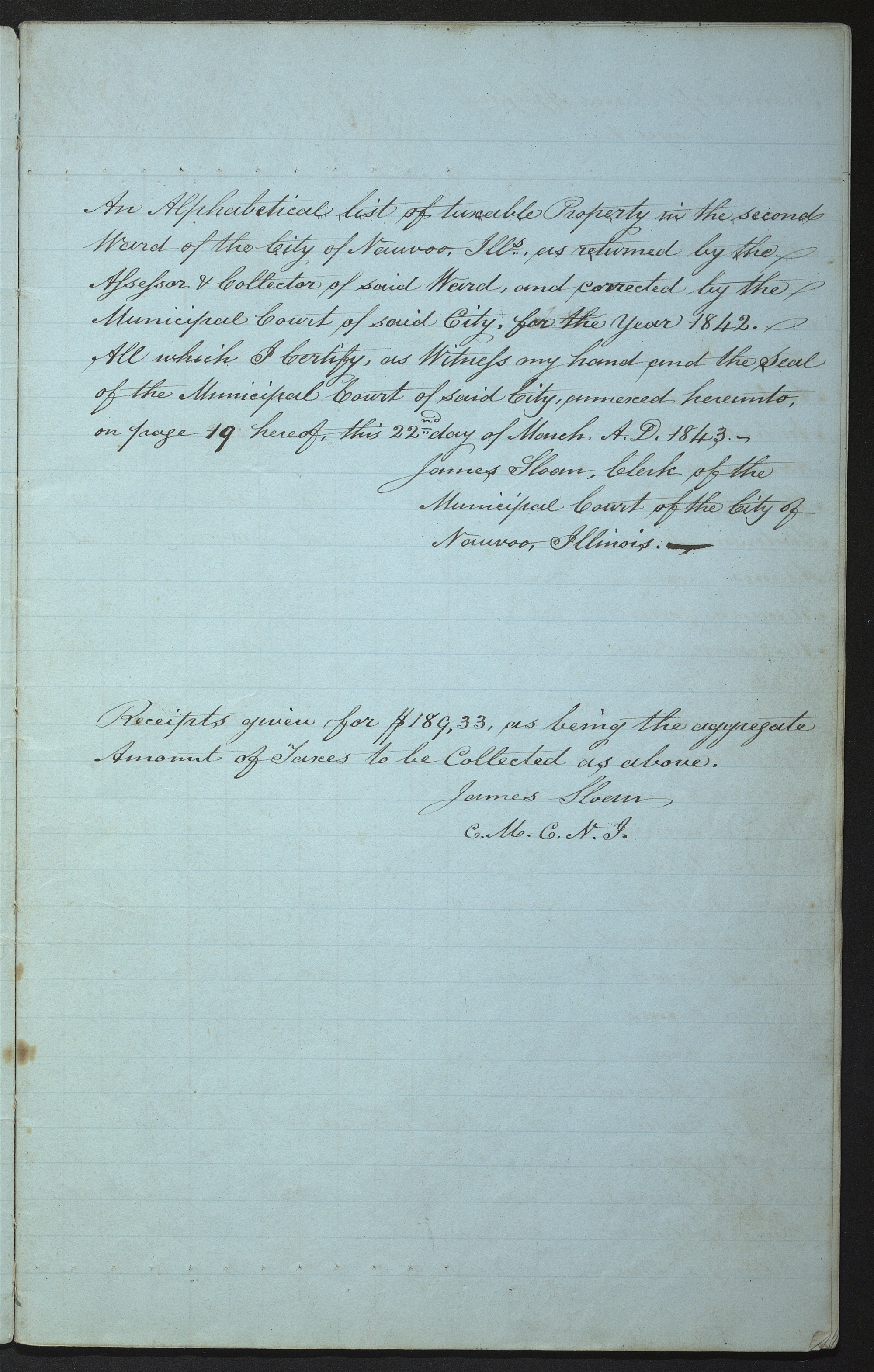 An Alphabetical list of taxable Property in the second Ward of the City of , Ills, as returned by the Assessor & Collector of said Ward, and corrected by the Municipal Court of said City, for the Year 1842. All which I Certify, as Witness my hand and the Seal of the Municipal Court of said City, annexed hereunto, on page 19 hereof, this 22nd day of March A. D. 1843.