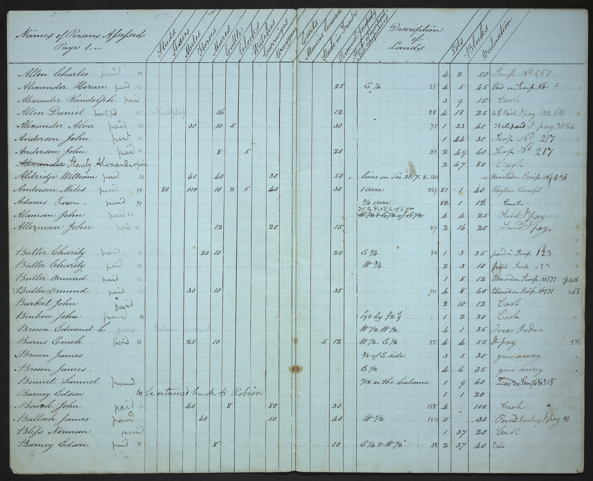 | Names of Persons Assessed Page 1 | Studs | Asses | Mules | Horses | Mares | Cattle | Clocks | Watches | Carriages | Waggons | Carts | Monies loaned | Stock in Trade | Personal Property | Stock of incorporated companies | Description of Lands | Lots | Blocks | Valuation | |