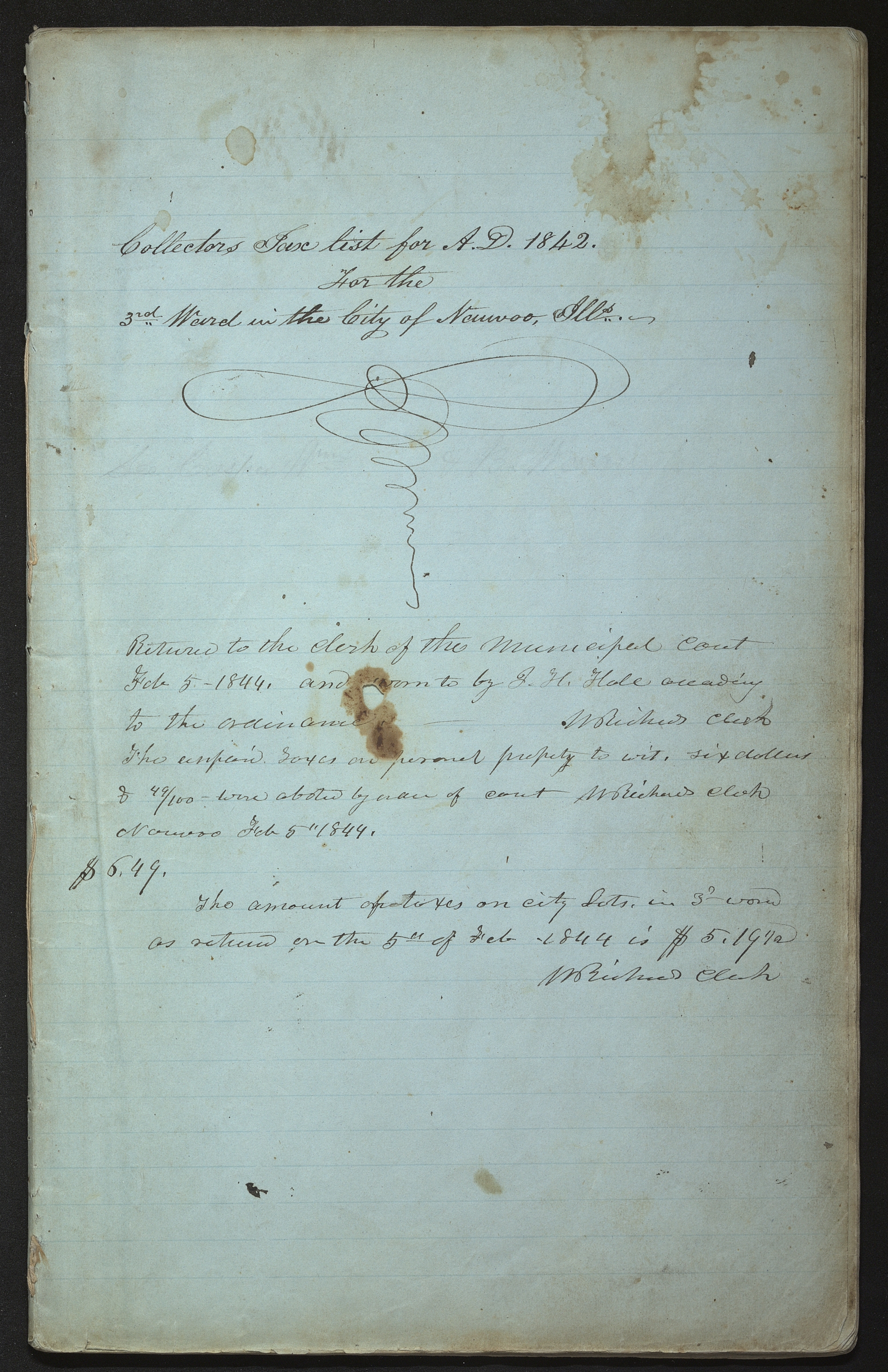 , Alphabetical List of Property in third ward, 1842, , Hancock Co., IL. Version copied [ca. 14 Feb.]–27 Mar. 1843; handwriting of and ; twenty-two pages; Nauvoo, IL, Records, 1841–1845, CHL. Includes seal.