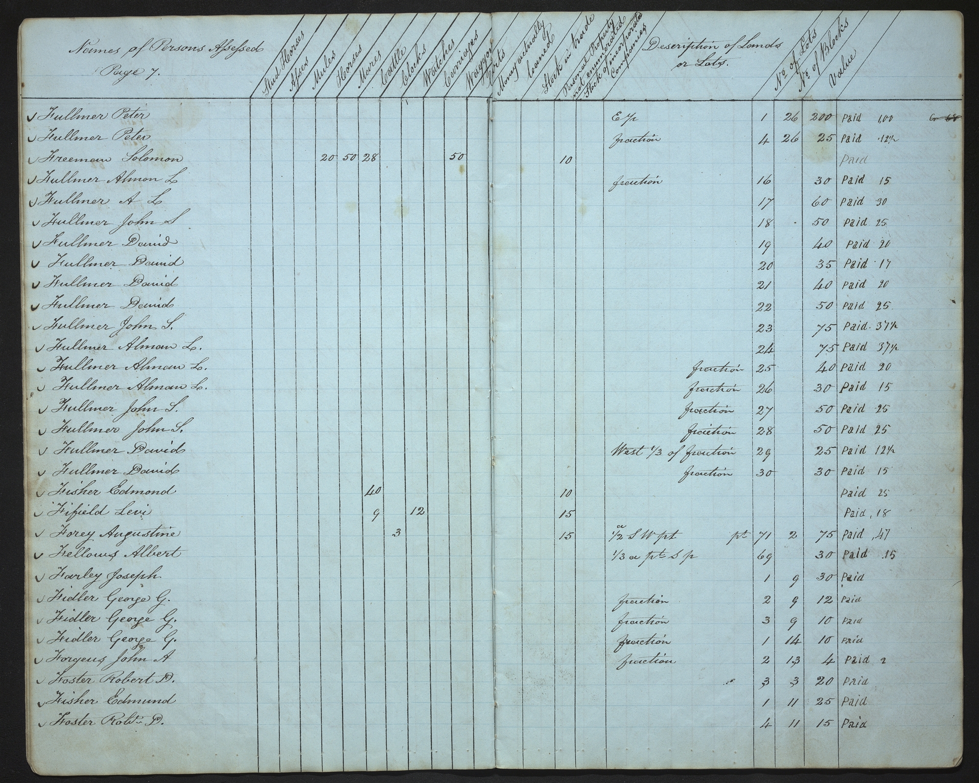 | Names of Persons Assessed Page 7. | Stud Horses | Asses | Mules | Horses | Mares | Cattle | Clocks | Watches | Carriages | Waggons | Carts | Money actually loaned | Stock in trade | Personal Property not enumerated | Stock of incorporated Companies | Description of Lands or Lots. | No of Lots | No of Blocks | Value | |