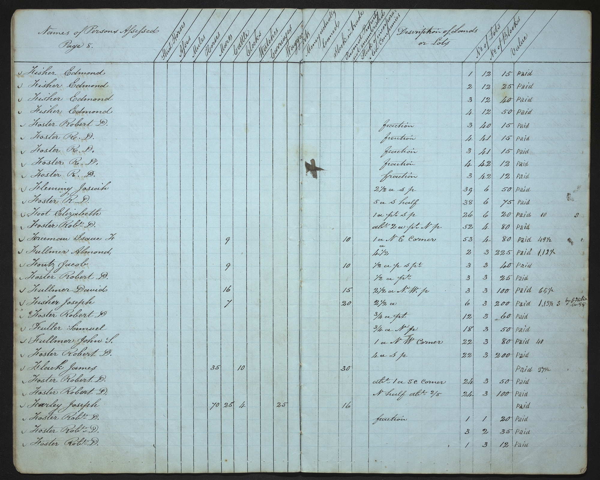 | Names of Persons Assessed Page 8. | Stud Horses | Asses | Mules | Horses | Mares | Cattle | Clocks | Watches | Carriages | Waggons | Carts | Money actually loaned | Stock in trade | Personal Property not enumerated | Stock of incorporated Companies | Description of Lands or Lots | No of Lots | No of Blocks | Value | |