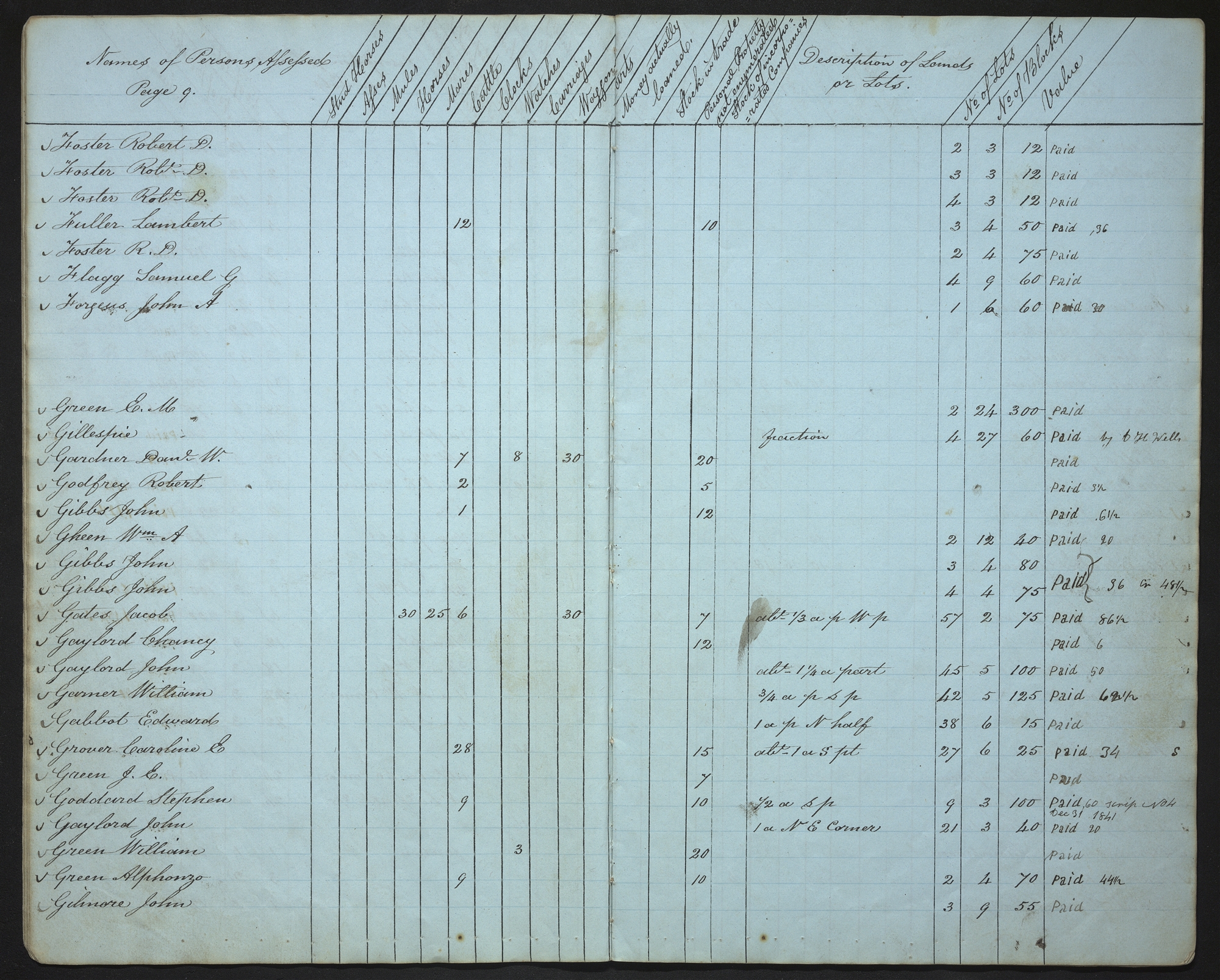 | Names of Persons Assessed Page 9. | Stud Horses | Asses | Mules | Horses | Mares | Cattle | Clocks | Watches | Carriages | Waggons | Carts | Money actually loaned. | Stock in trade | Personal Property not enumerated | Stock of incorporated Companies | Description of Lands or Lots. | No of Lots | No of Blocks | Value | |