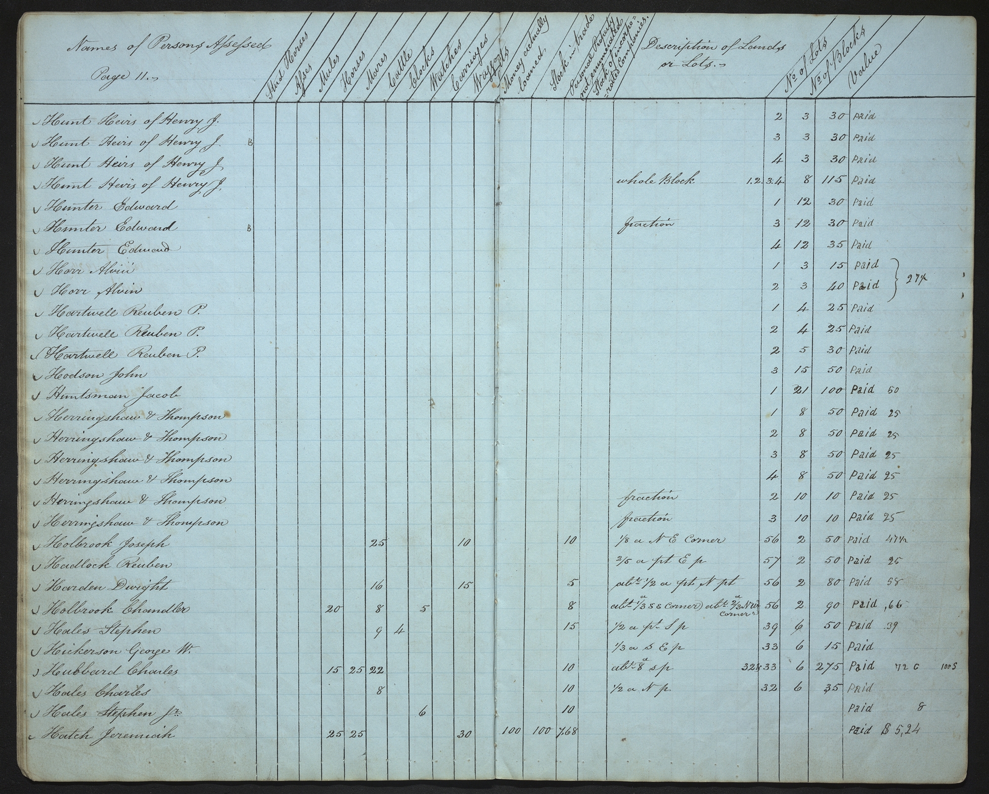 | Names of Persons Assessed Page 11.— | Stud Horses | Asses | Mules | Horses | Mares | Cattle | Clocks | Watches | Carriages | Waggons | Carts | Money actually loaned | Stock in trade | Personal Property not enumerated | Stock of incorporated Companies. | Description of Lands or Lots.— | No of Lots | No of Blocks | Value | |