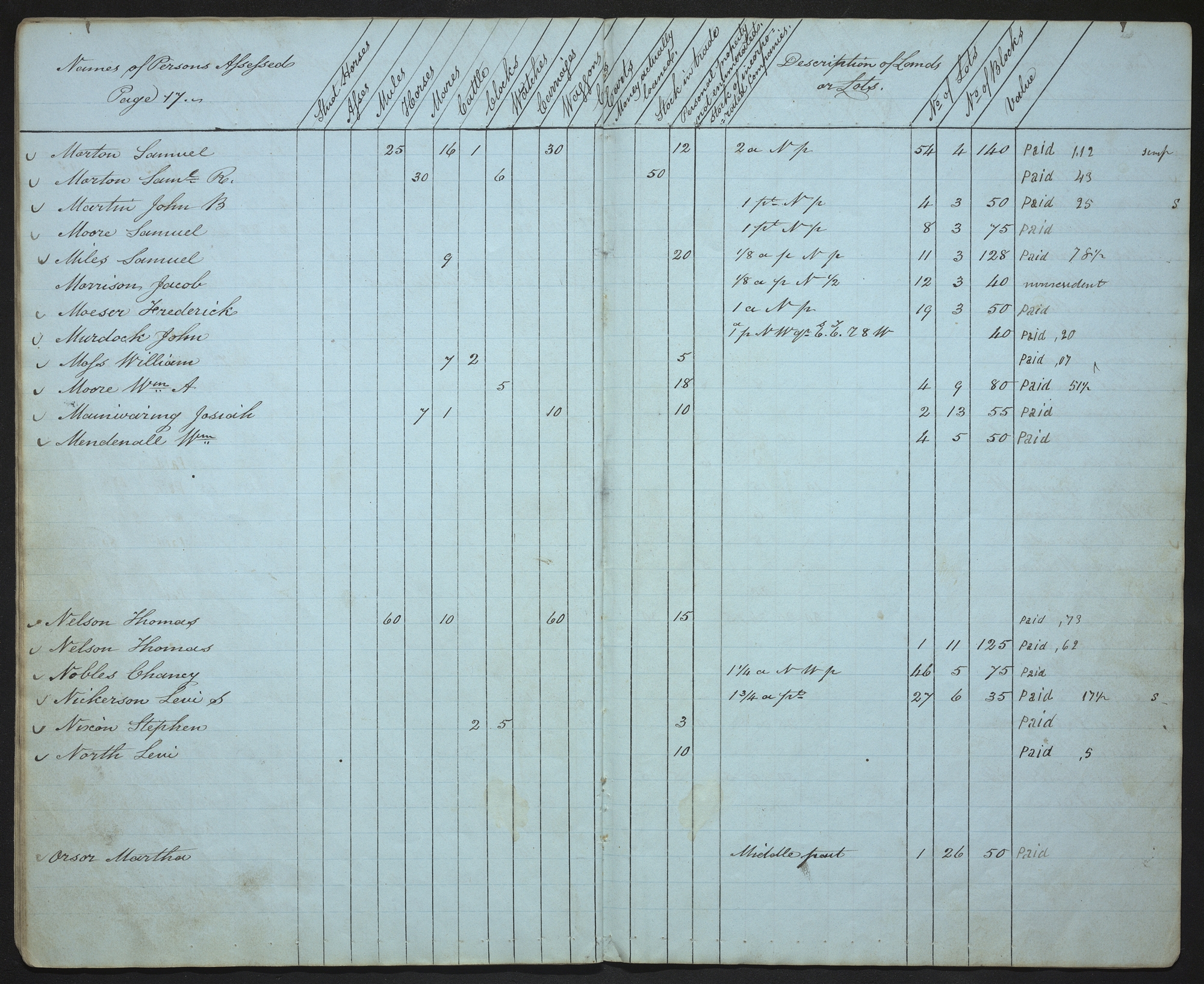 | Names of Persons Assessed Page 17.— | Stud Horses | Asses | Mules | Horses | Mares | Cattle | Clocks | Watches | Carriages | Waggons | Carts | Money actually loaned. | Stock in trade | Personal property not enumerated. | Stock of incorporated Companies. | Description of Lands or Lots. | No of Lots | No of Blocks | Value | |