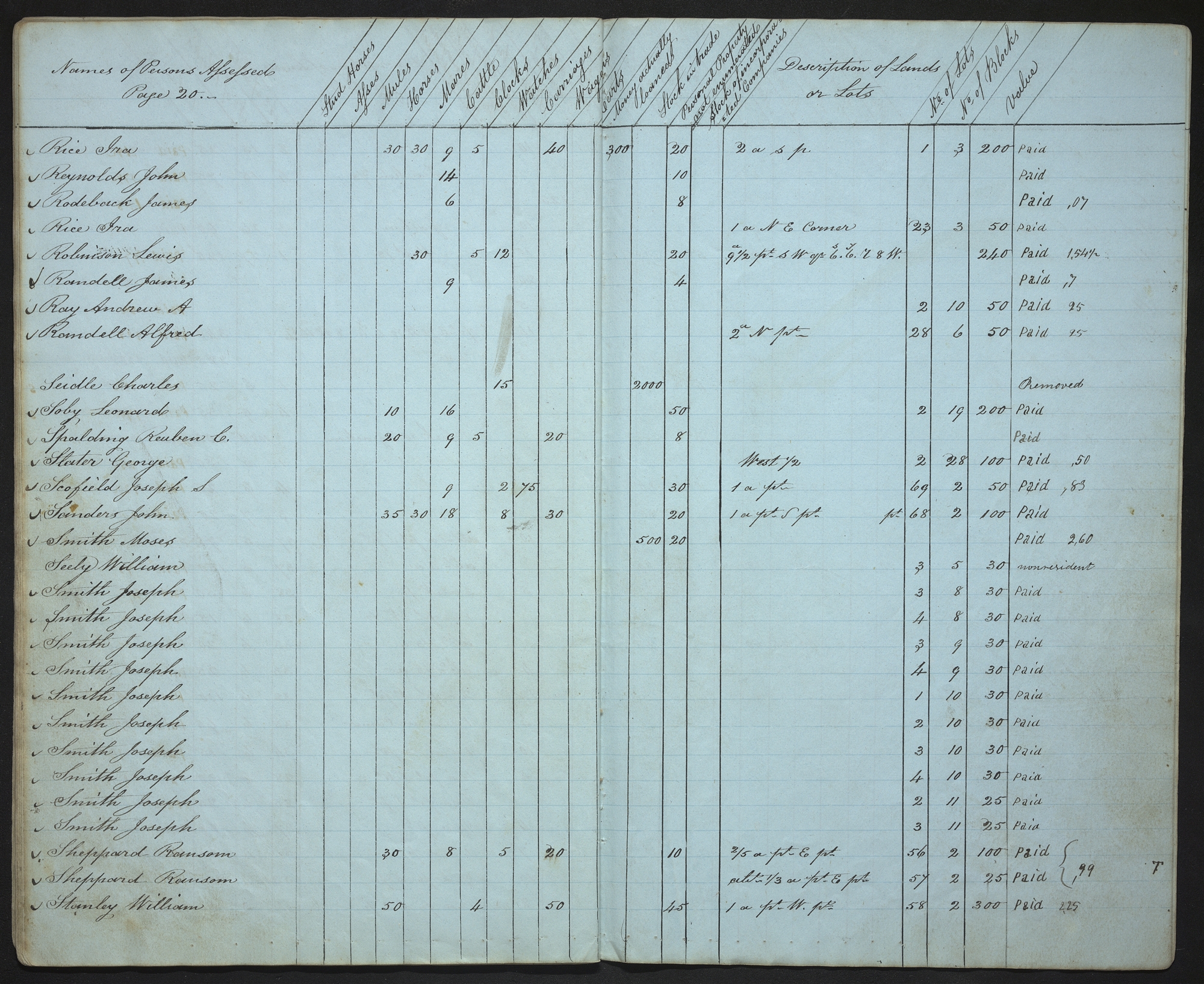 | Names of Persons Assessed Page 20.— | Stud Horses | Asses | Mules | Horses | Mares | Cattle | Clocks | Watches | Carriages | Waggons | Carts | Money actually loaned | Stock in trade | Personal property not enumerated | Stock of incorporated Companies | Description of Lands or Lots | No of Lots | No of Blocks | Value | |