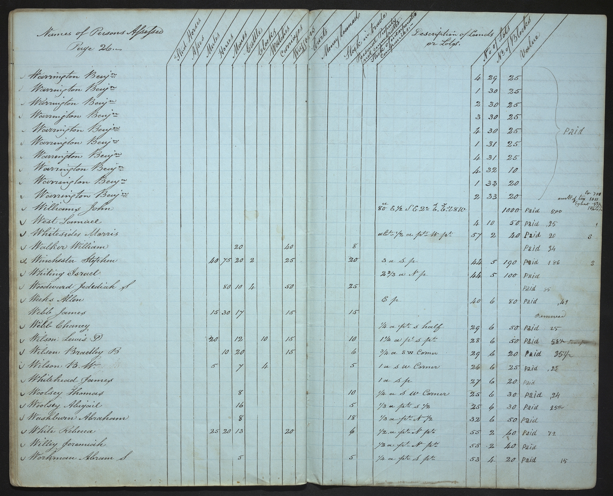 TEXT: ”Paid” is paired with a brace spanning ten rows, indicating that all these taxes for Warrington were paid.
