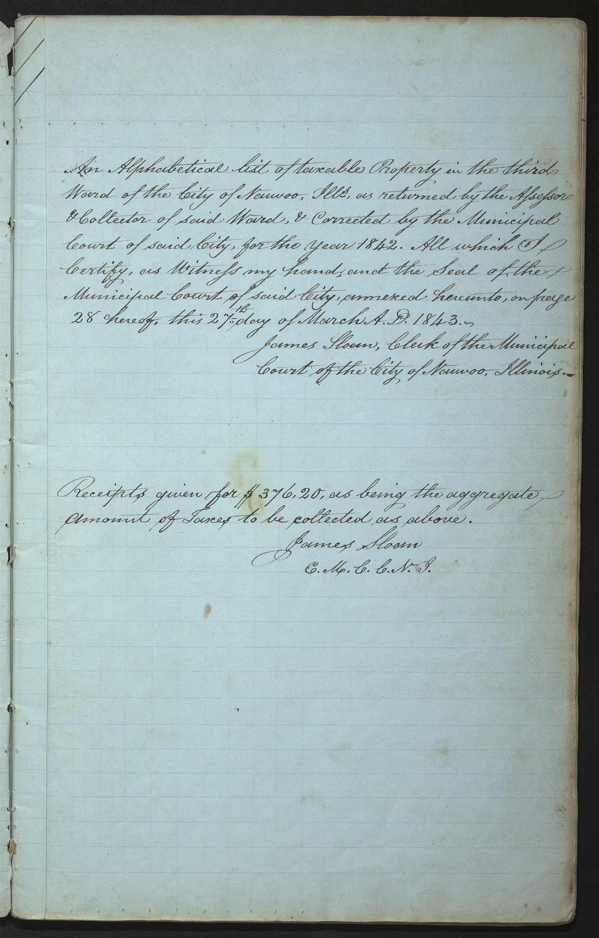 , Alphabetical List of Property in third ward, 1842, , Hancock Co., IL. Version copied [ca. 14 Feb.]–27 Mar. 1843; handwriting of and ; twenty-two pages; Nauvoo, IL, Records, 1841–1845, CHL. Includes seal.