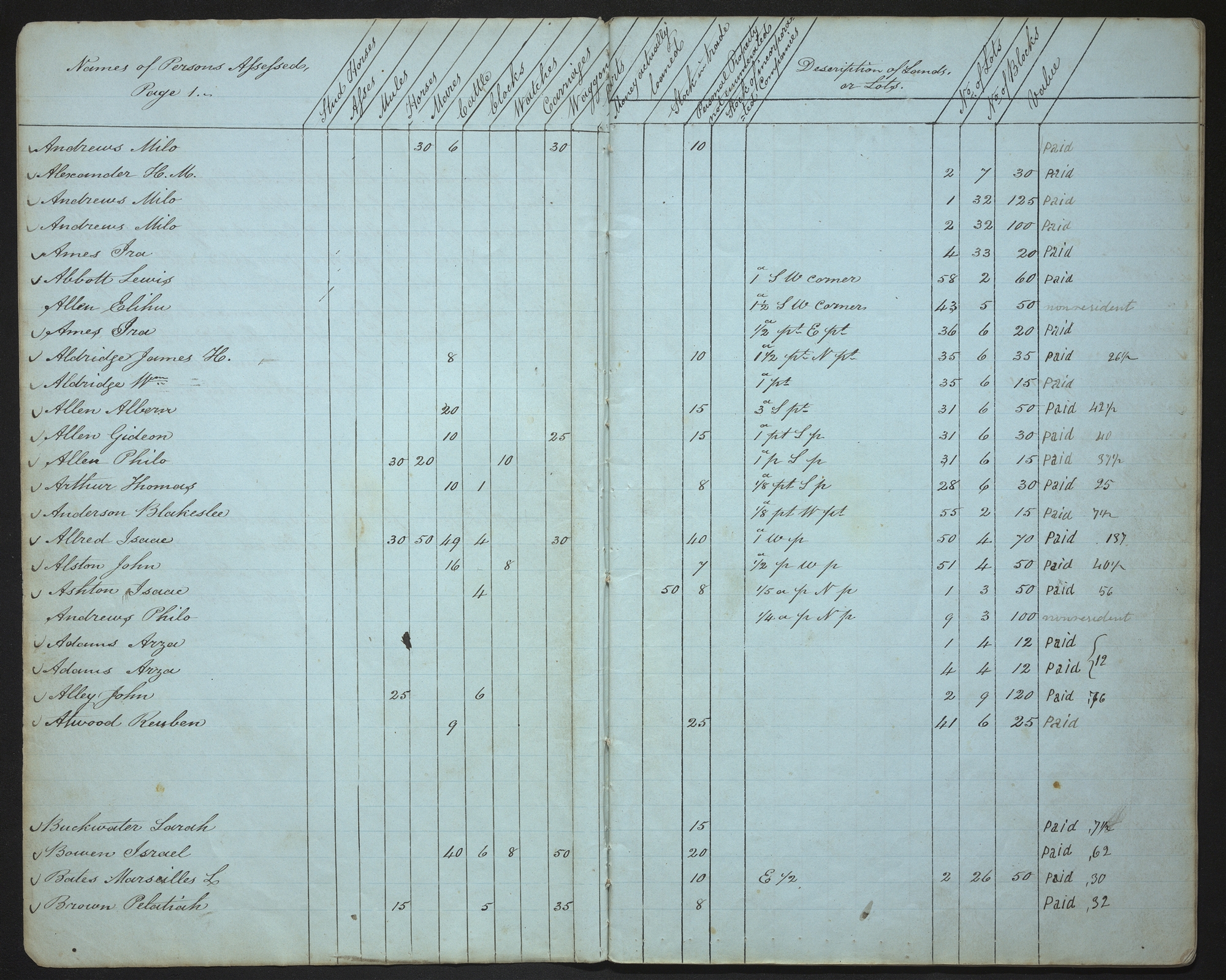 | Names of Persons Assessed, Page 1.— | Stud Horses | Asses | Mules | Horses | Mares | Cattle | Clocks | Watches | Carriages | Waggons | Carts | Money actually loaned | Stock in trade | Personal Property not enumerated | Stock of incorporated Companies | Description of Lands, or Lots. | No. of Lots | No of Blocks | Value | |