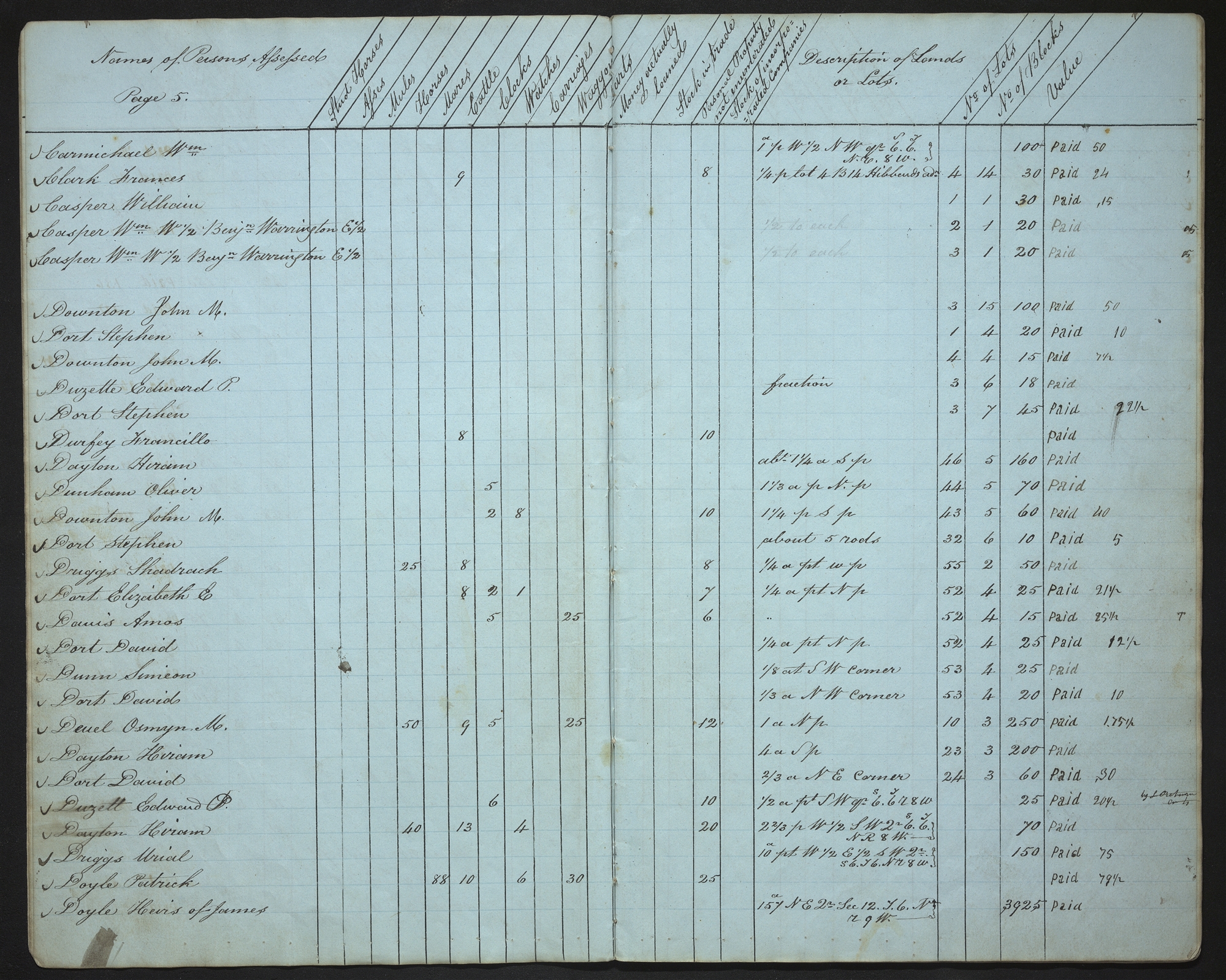 | Names of Persons Assessed Page 5. | Stud Horses | Asses | Mules | Horses | Mares | Cattle | Clocks | Watches | Carriages | Waggons | Carts | Money actually loaned | Stock in trade | Personal Property not enumerated | Stock of incorporated Companies | Description of Lands or Lots. | No of Lots | No of Blocks | Value | |