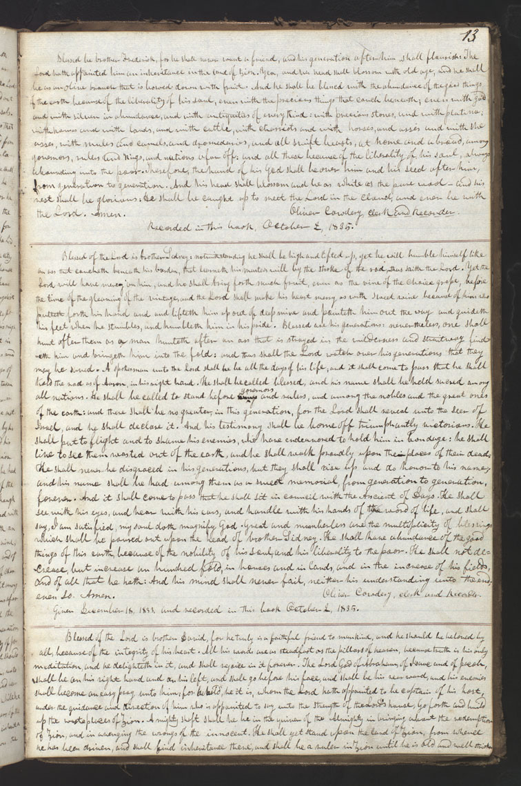 Sidney Rigdon’s blessing in JS’s journal is prefaced with the following: “Brother Sidney is a man whom I love but is not capab[le] of that pure and stedfast love for those who are his benefactors as should possess the breast of a Presedent of the chu[r]ch of Christ this with some other little things such as a selfish and indipendance of mind which to[o] often manifest distroys the confidence of those who would lay down their lives for him but notwithstanding these things he is a very great and good man a man of great power of words and can gain the friendship of his hearrers very quick he is a man whom god will uphold if he will continue faithful to his calling O God grant that he may for the Lords sake Amen the man who willeth to do well we should extall his virtues and speak not of his faults behind his back a man who willfuly turneth away from his friend without a cause is not easily forgiven. the kindness of a man should never be forgotten that person who never forsaketh his trust should ever have the highest place for regard in our hearts and our love should never fail but increase more and more and this my disposition and sentiment &c Amen.” (JS, Journal, 14–19 Nov. 1833.)