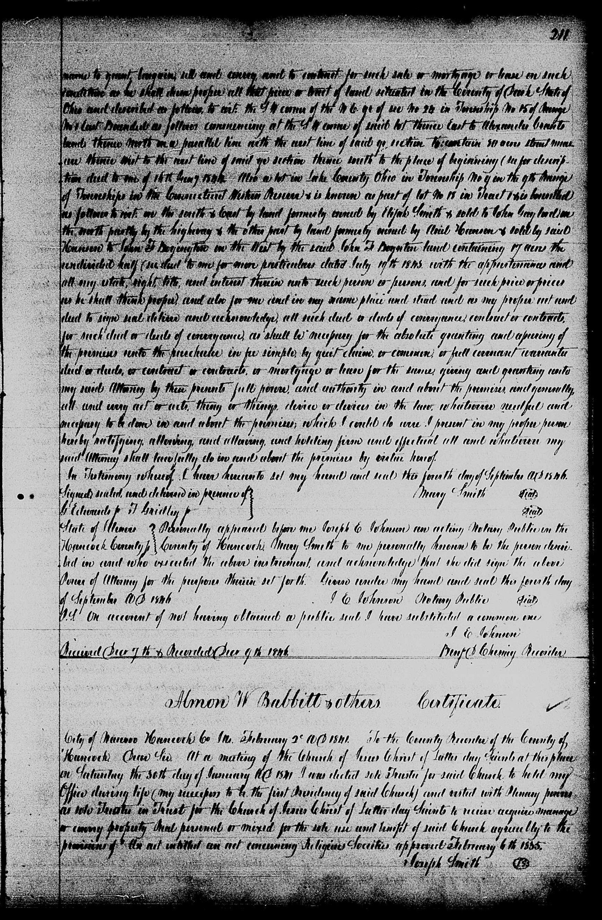 JS, Appointment as Trustee, , Hancock Co., IL, 2 Feb. 1841; attested by , , and , , IL, [3 Feb. 1841]; certified by , 3 Feb. 1841. Version copied 10 Dec. 1846 in Appointment of Almon Babbit, Joseph L. Heywood, and John S. Fullmer as Trustees, 24 Jan. 1846, Lake County Deed Record E, pp. 211–212; handwriting of Benjamin D. Chesney; Lake County Courthouse, Painesville, OH; microfilm at Family Search Library, Salt Lake City, UT.