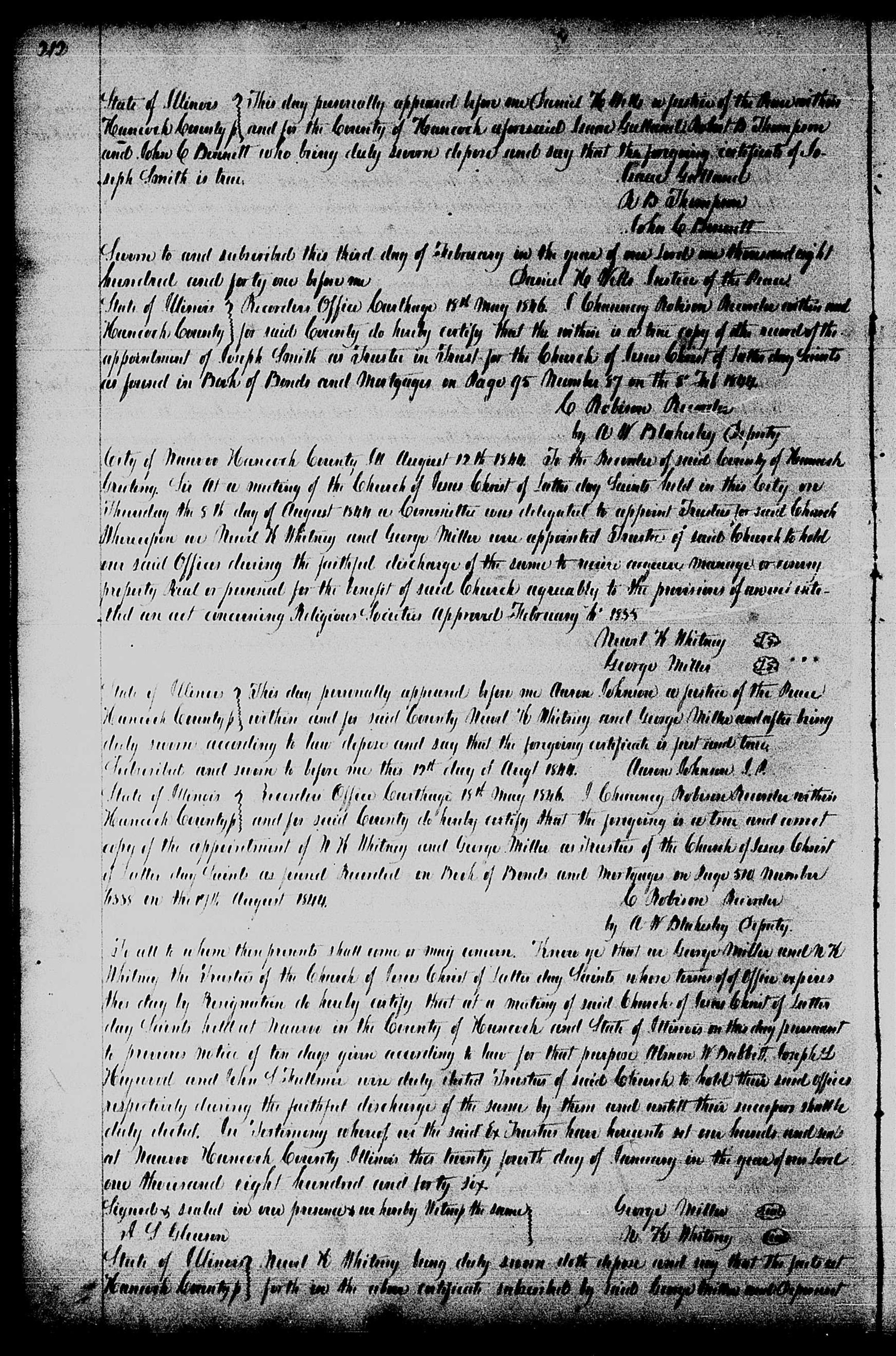 Recorders Office 18th May 1846. I Recorder within and for said do hereby certify that the within is a true copy of the record of the appointment of Joseph Smith as Trustee in Trust for the Church of Jesus Christ of Latter day Saints as found in Book of Bonds and Mortgages on Page 95 Number 87 on the 8th Feb 1844.