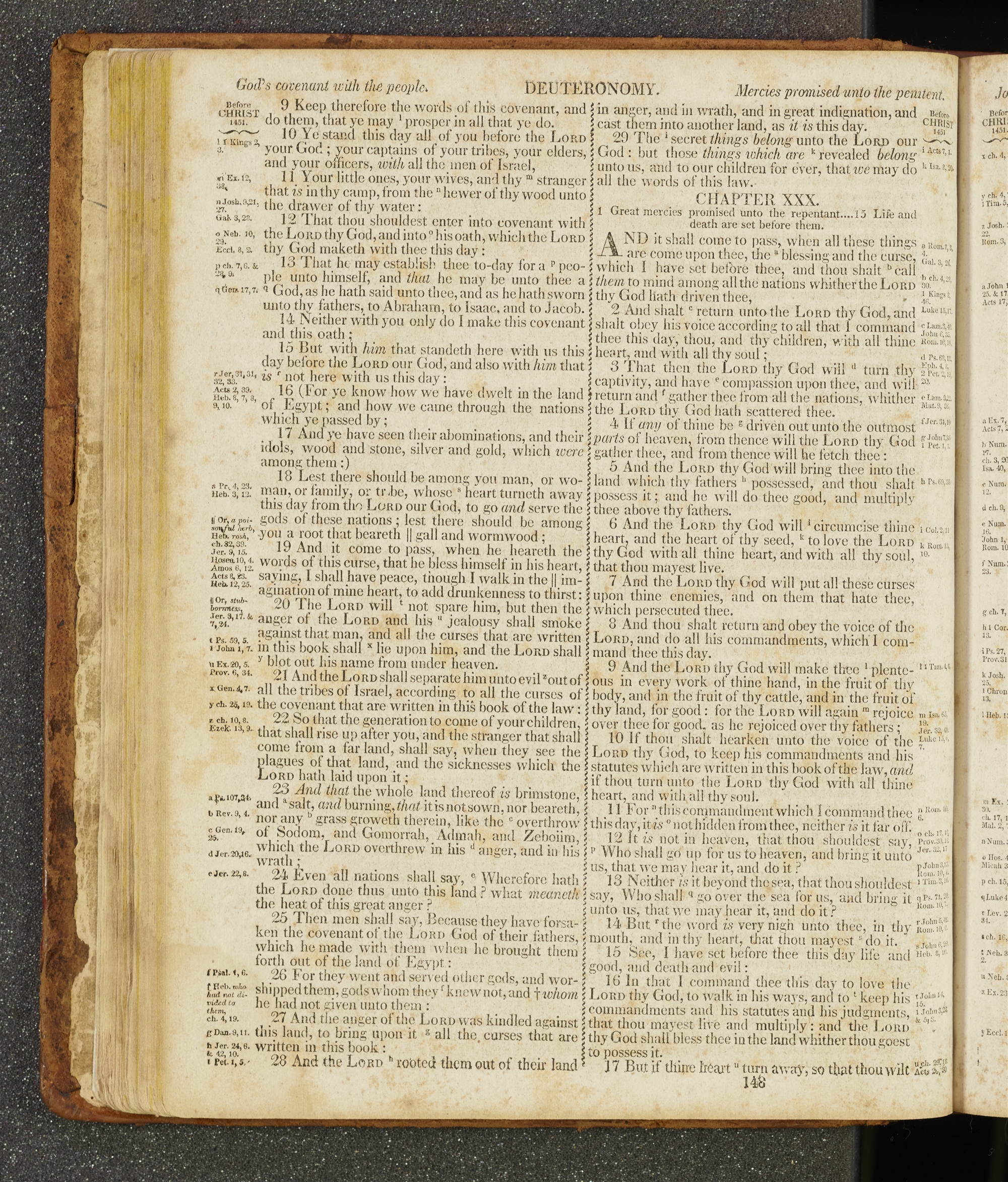 The Holy Bible, Containing the Old and New Testaments: Together with the Apocrypha: Translated Out of the Original Tongues, and With the Former Translations Diligently Compared and Revised. With Caine’s Marginal Notes and References, to Which are Added, an Index: an Alphabetical Table of All the Names in the Old and New Testaments, With their Significations; Tables of Scripture Weights, Measures, and Coins, &c. Cooperstown, NY: H. & E. Phinney, 1828. The copy presented here was used by JS in his Bible Revision project and is now held at the Church History Library in Salt Lake City.