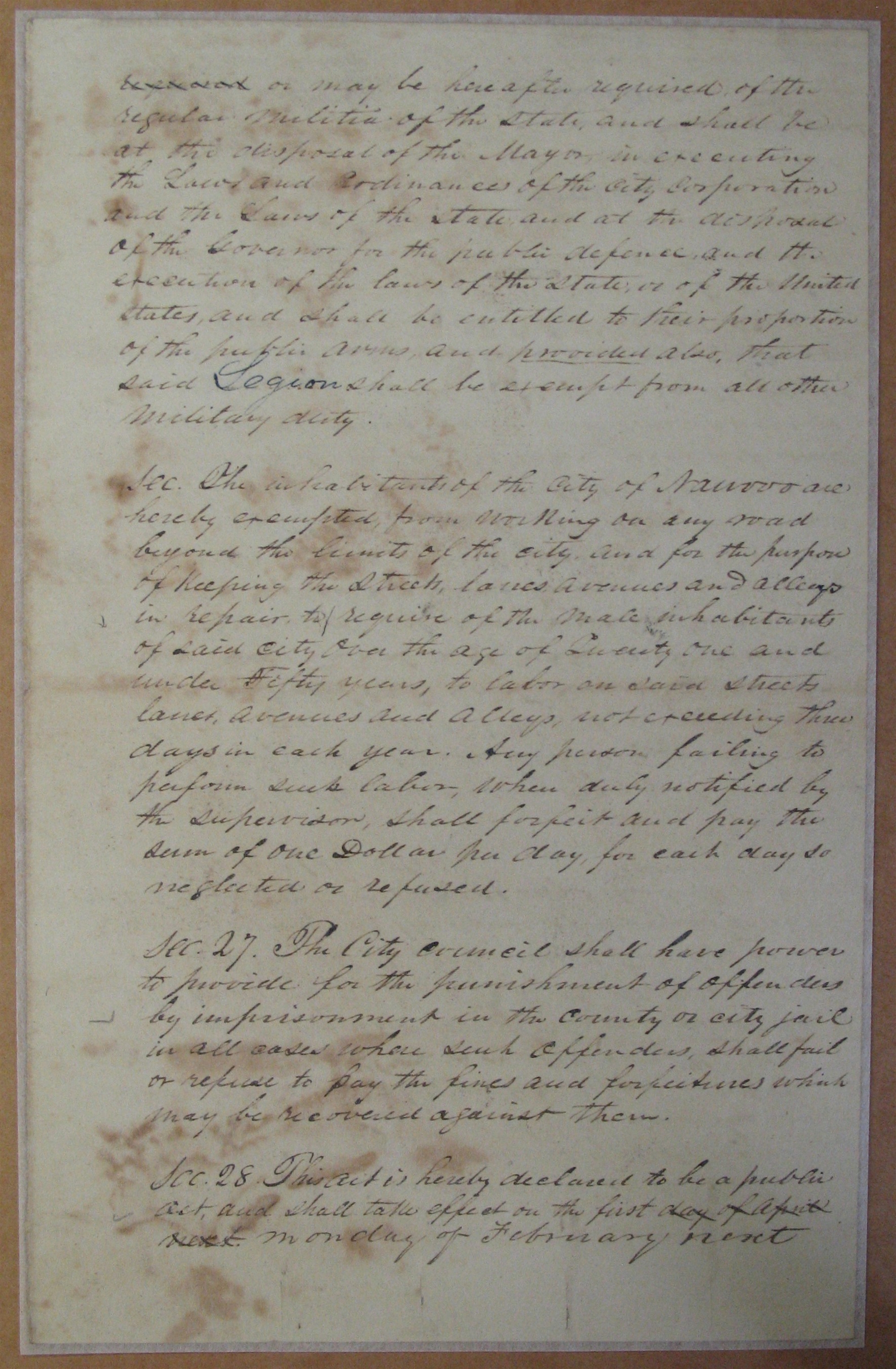 Sec. [26.] The inhabitants of the City of are hereby exempted from working on any road beyond the limits of the and for the purpose of keeping the streets, lanes avenues and alleys in repair to require of the male inhabitants of said Over the age of Twenty one and under Fifty years, to labor on said streets lanes, avenues and alleys, not exceeding three days in each year. Any person failing to perform such labor, when duly notified by the supervisor, shall forfeit and pay the sum of one Dollar per day, for each day so neglected or refused.