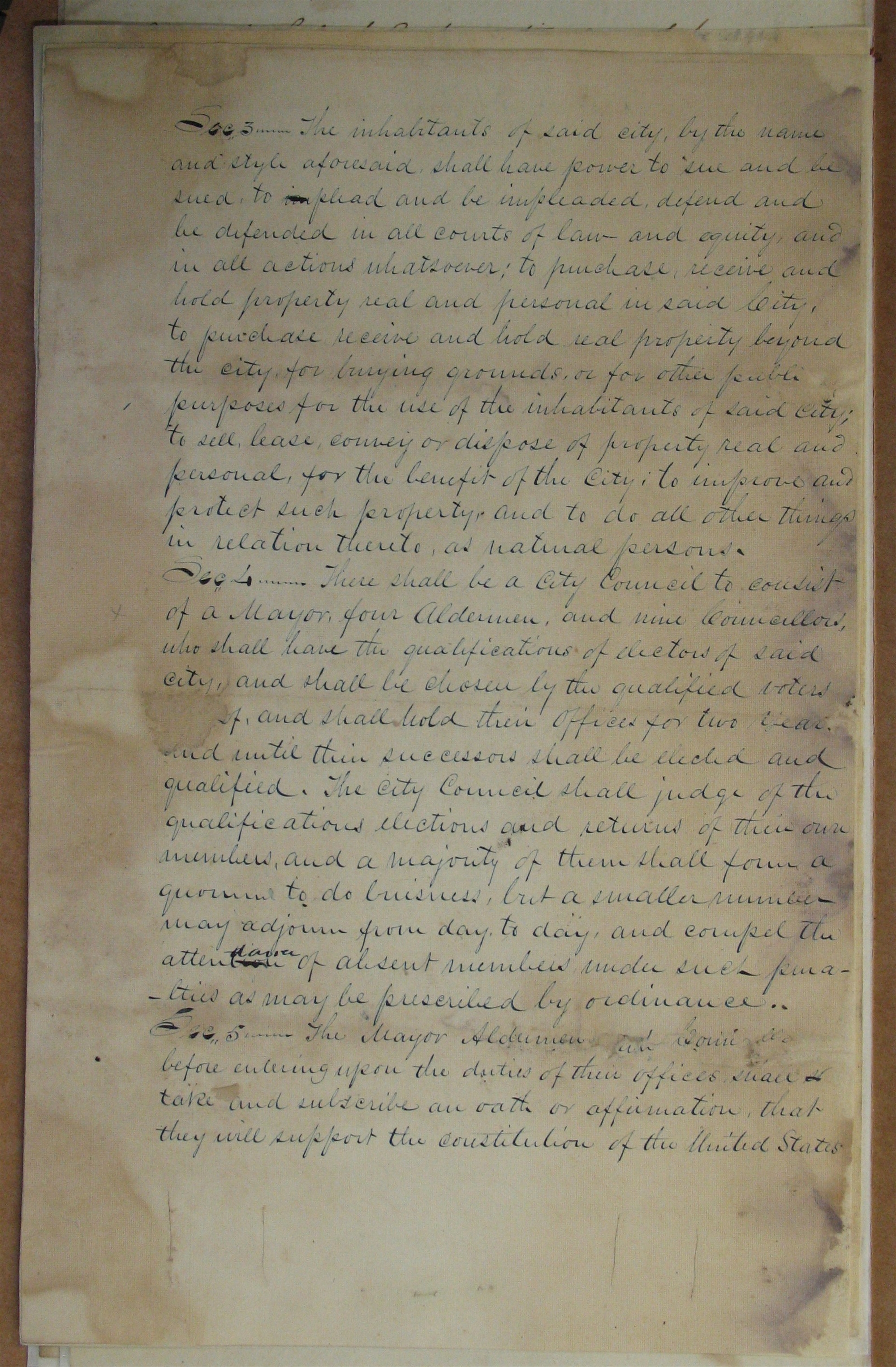 Sec. 4— There shall be a City Council to consist of a Mayor, four Aldermen, and nine Councillors, who shall have the qualifications of electors of said , and shall be chosen by the qualified voters [thereo]f, and shall hold their Offices for two years, and until their successors shall be elected and qualified. The city Council shall judge of the qualifications elections and returns of their own members, and a majority of them shall form a quorum to do buisness, but a smaller number may adjourn from day to day, and compel the attention <attendance> of absent members under such penalties as may be prescribed by ordinance.