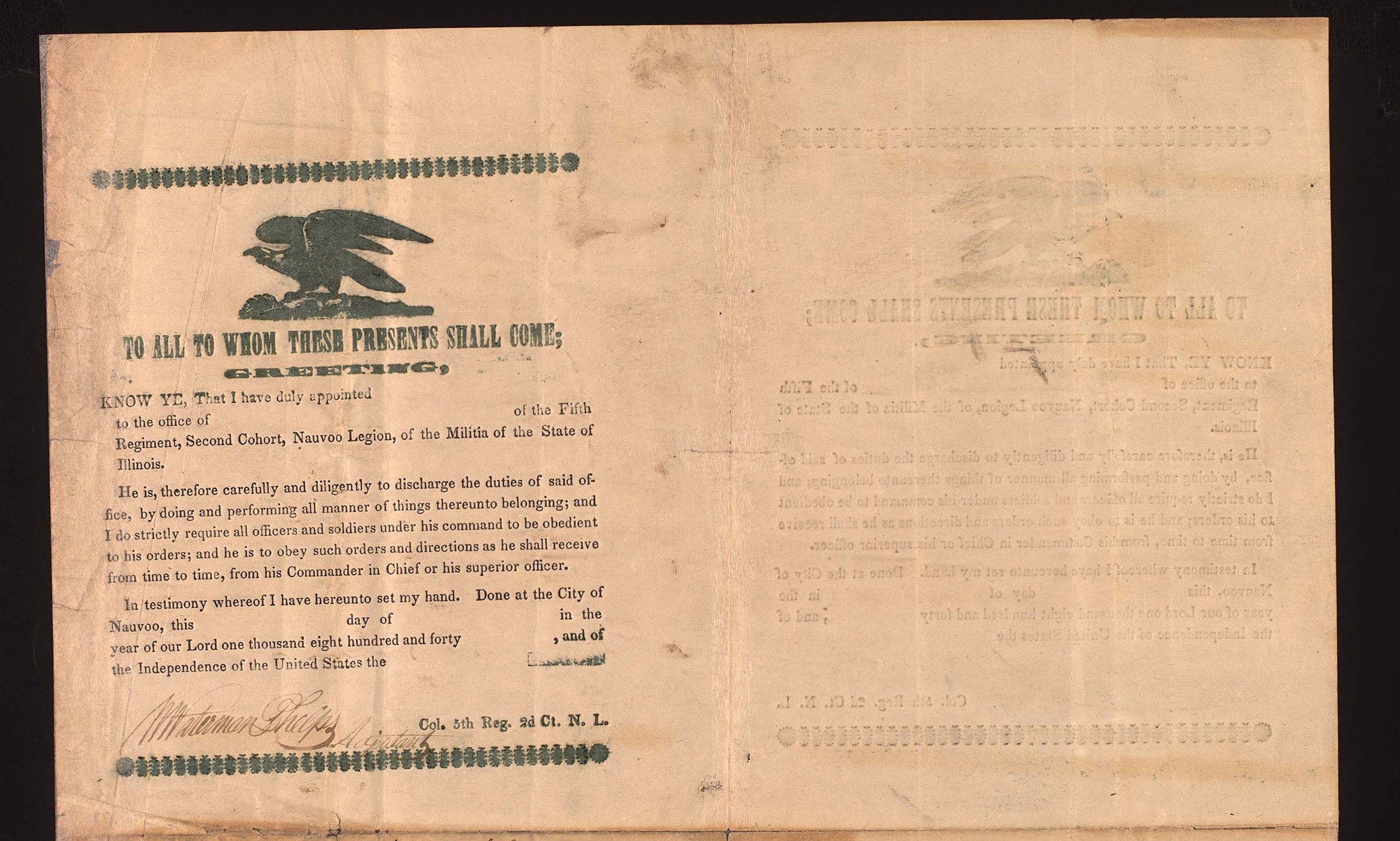 Blank Commission Forms for Second Cohort Fifth Regiment, , Hancock Co., IL, [after 12 June 1843]; printed forms; signatures of W. Waterman Phelps; docket in unidentified handwriting; four pages; Nauvoo Legion Records, CHL. Includes docket.