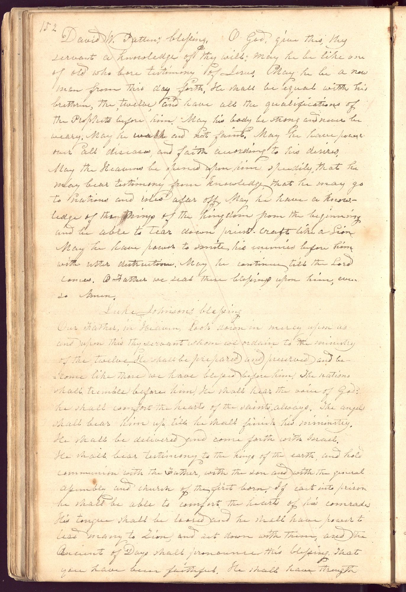 Our Father, in Heaven, look down in mercy upon us and upon this thy servant whom we to the ministry of the twelve. He shall be prepared and preserved and become like those we have blessed before him, The nations shall tremble before him. He shall hear the voice of God: he shall comfort the hearts of the saints, always. The angels shall bear him up till he shall finish his ministry. He shall be delivered and come forth with Israel. He shall bear testimony to the kings of the earth, and hold communion with the Father, with the son and with the general assembly and church of the first born. If cast into prison he shall be able to comfort the hearts of his comrades His tongue shall be loosed and he shall have power to lead many to , and set down with them, and the Ancient of Days shall pronounce this blessing. That you have been faithful. He shall have strength [p. 152]