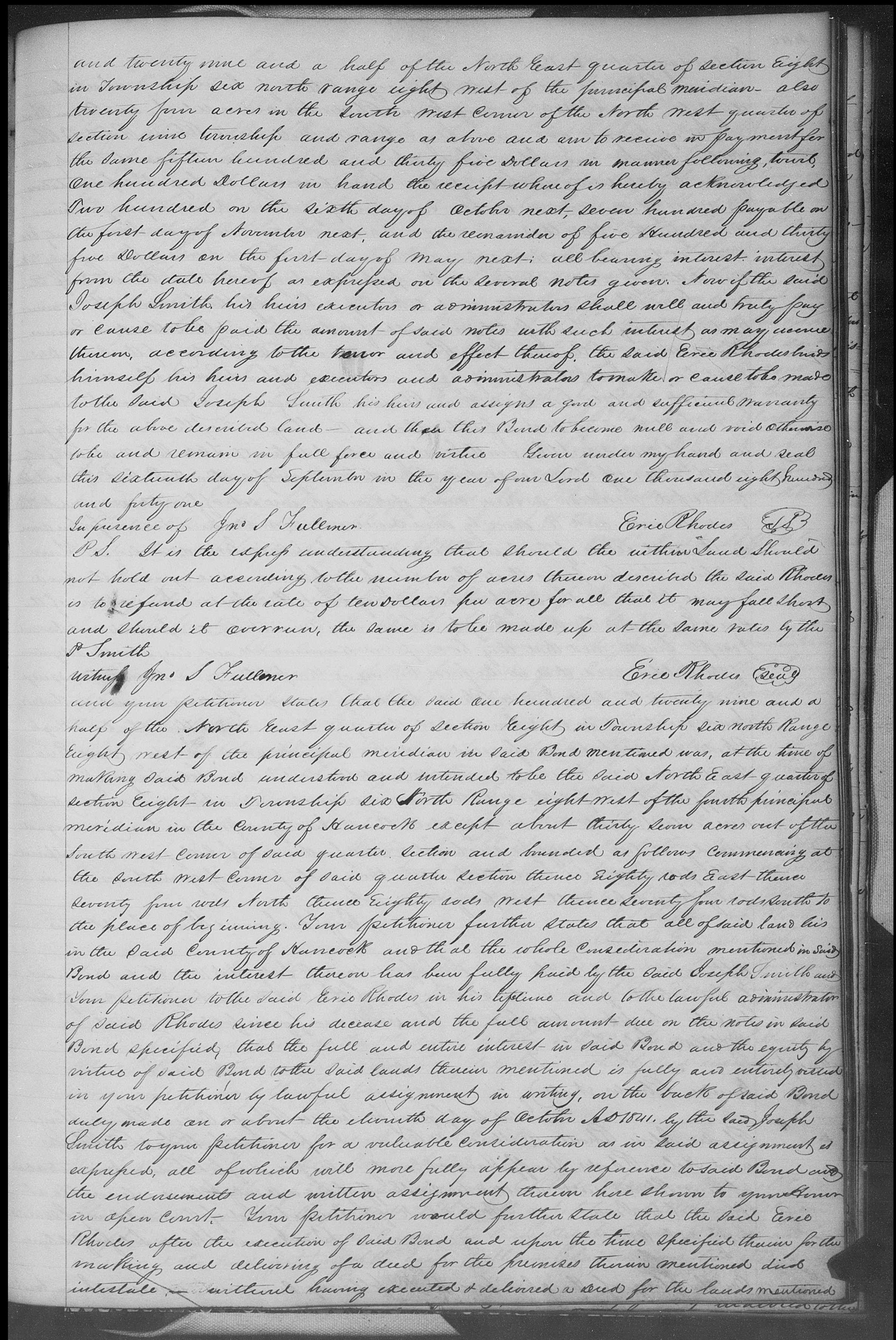 Erie Rhodes, Bond for property in , IL, to JS, 16 Sept. 1841. Copied [21 Oct. 1843] in George Bachman and Onias Skinner on behalf of William Clayton, Bill in Chancery, Hancock County Circuit Court, Chancery Court Records, 1838–1924, vol. B, pp. 444–445; handwriting of ; Hancock County Courthouse, Carthage, IL; microfilm at FHL.