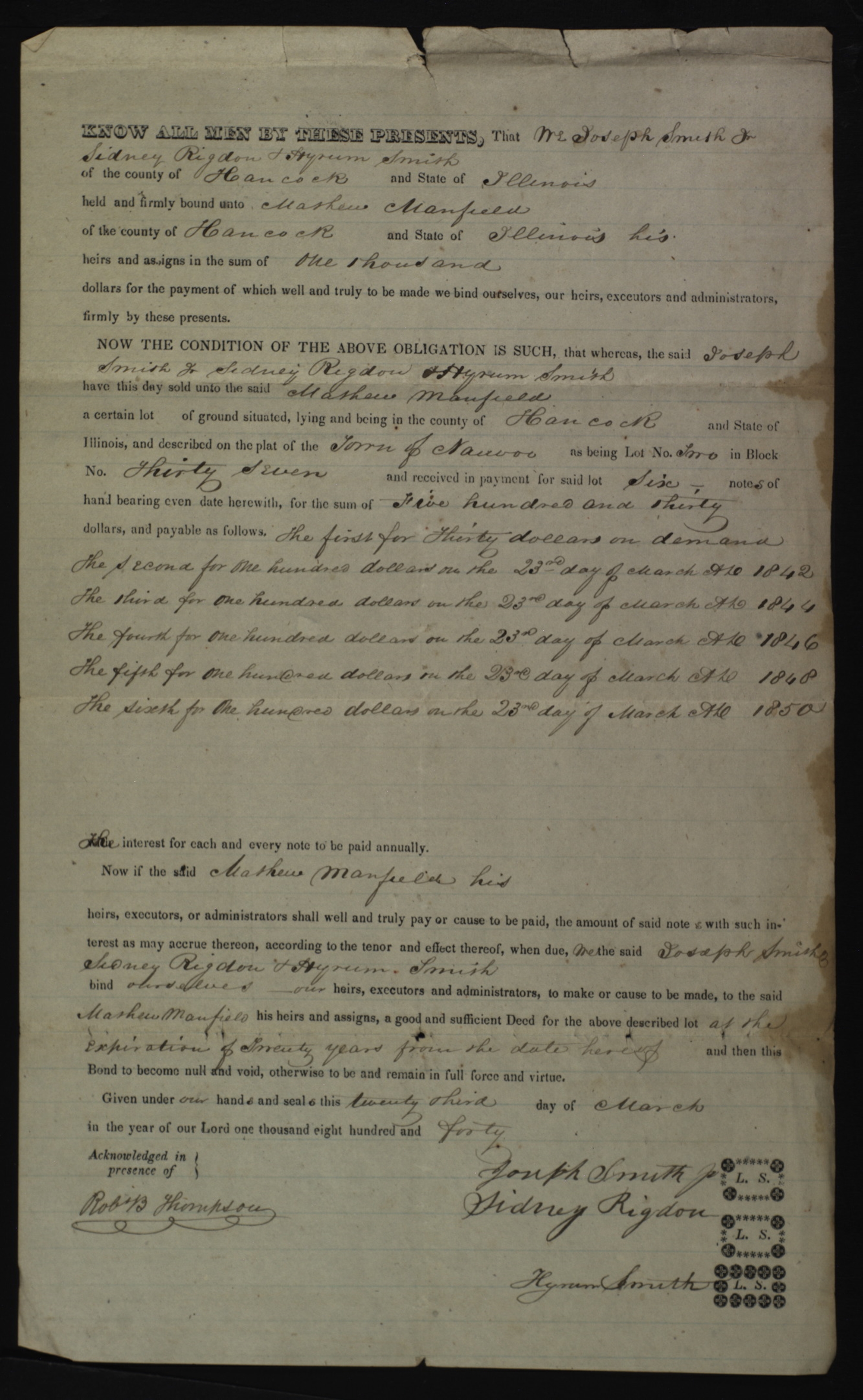 NOW THE CONDITION OF THE ABOVE OBLIGATION IS SUCH, that whereas, the said Joseph Smith Jr & have this day sold unto the said Mathew Manfield a certain lot of ground situated, lying and being in the county of and State of Illinois, and described on the plat of the Town of as being Lot No. Two in Block No. Thirty Seven and received in payment for said lot Six— notes of hand bearing even date herewith, for the sum of Five hundred and thirty dollars, and payable as follows.