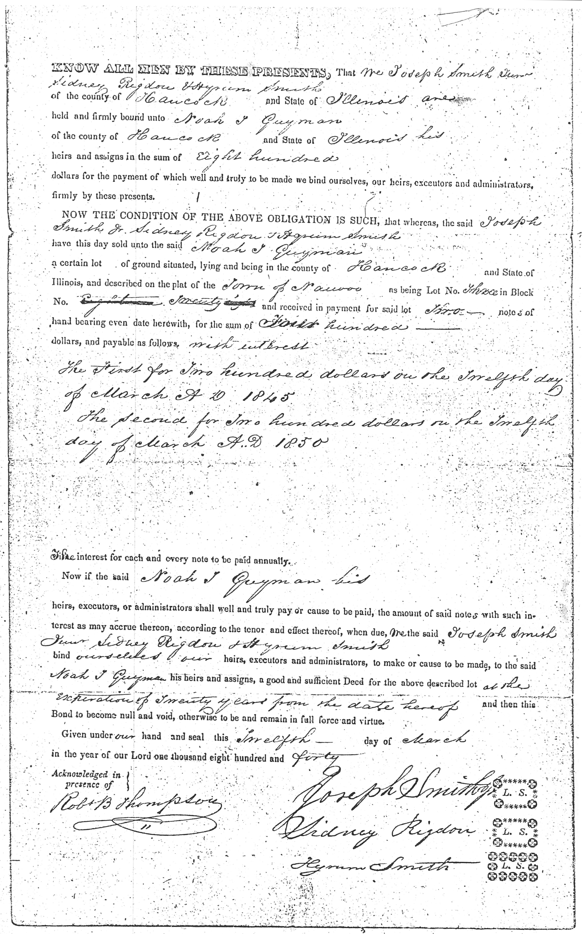 Now if the said his heirs, executors, or administrators shall well and truly pay or cause to be paid, the amount of said notes with such interest as may accrue thereon, according to the tenor and effect thereof, when due, we the said Joseph Smith Junr & bind ourselves our heirs, executors and administrators, to make or cause to be made, to the said his heirs and assigns, a good and sufficient Deed for the above described lot at the expiration of Twenty years from the date hereof and then this Bond to become null and void, otherwise to be and remain in full force and virtue.