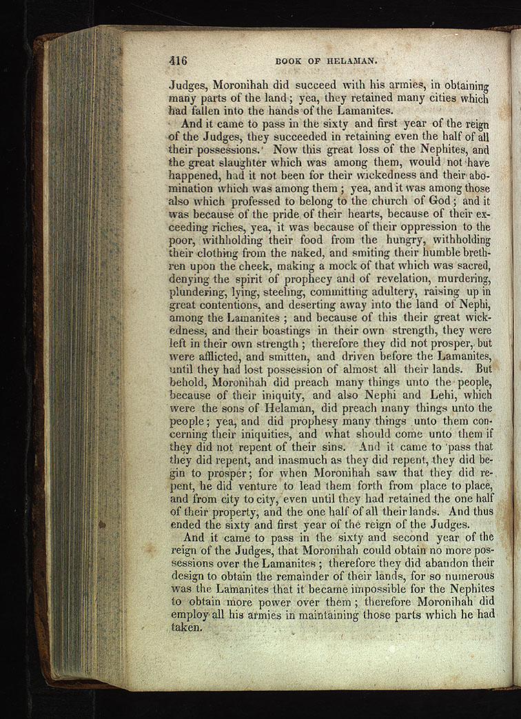 And it came to pass in the sixty and second year of the reign of the Judges, that Moronihah could obtain no more possessions over the Lamanites; therefore they did abandon their design to obtain the remainder of their lands, for so numerous was the Lamanites that it became impossible for the Nephites to obtain more power over them; therefore Moronihah did employ all his armies in maintaining those parts which he had taken. [p. 416]